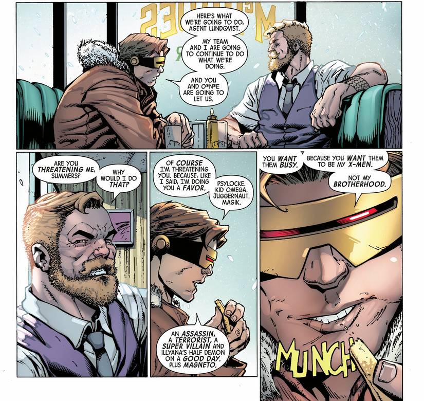 En X-Men #3 de Jed MacKay, Ryan Stegman, Marte Gracia y Clayton Cowles, Scott Summers se sienta para una tensa reunión con el Agente Lundqvist de O*N*E sobre la participación de los X-Men en un incidente reciente con un mutante emergente. Cyclops no solo aprovecha la oportunidad para recordarle a Lundqvist que la nueva base de los X-Men fue parte de un acuerdo con él, personalmente, sino que también revela que su actual alineación de equipo es un “favor” para todos.