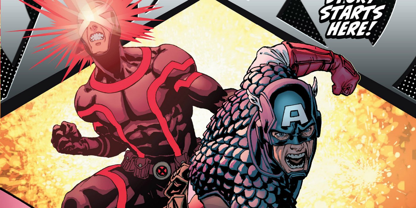 La historia de Andrés Mossa vio a Cyclops y al Capitán América reclutados por un Skrull que creía que agentes corruptos se habían infiltrado en la Tierra. Inicialmente había venido a buscar a Charles Xavier, el telépata más importante del mundo, pero no había podido localizarlo; el Skrull no sabía que un cíclope influenciado por Phoenix había matado a Xavier al final de “Avengers Vs. X-Men”. En su lugar, decidió reclutar a los líderes de los X-Men y los Vengadores, sin darse cuenta de la mala sangre entre los dos, y los teletransportó. Cap fue recogido mientras montaba su bicicleta; Cyclops estaba en el medio de cocinar panqueques. Cuando fueron liberados de la estasis al horror de los Skrull, no perdieron el tiempo y Cyclops usó la sartén como arma.