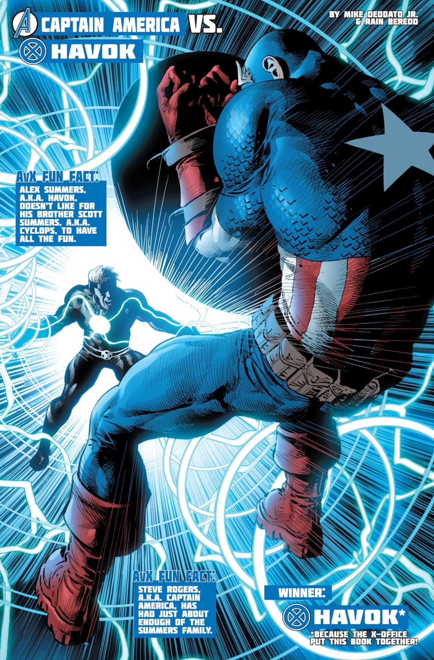 En una batalla de una sola página en AVX: Vs. #6-Escritado por Kieron Gillen, con el arte del hermano de Jim Cheung-Cyclops, Havok, que tiene habilidades similares a absorbente cósmico, se enfrenta al Capitán América y reclama fácilmente la victoria. Mientras que el hermano de Cyclops elimina fácilmente al primer vengador de Marvel, el propio Scott Summers ha luchado previamente para asegurar una victoria sobre Steve Rogers y su naturaleza persistente.