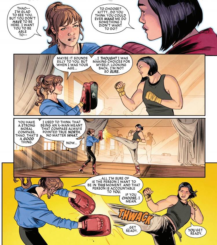 En X-Men excepcionales #5 – escrito por Eve L. Ewing, con arte de Carmen Carnero – Kitty se encuentra cara a cara con sus acciones pasadas cuando se les revela a sus nuevos aprendices de X-Men que Kitty Pryde mató a personas en las consecuencias de Krakoa y a uno de sus nuevos X-Men recluta, Melee, abandona. Cuando Melee regresa, Kitty le dice a Melee que quiere que tenga una opción, algo que Kitty sentía que realmente no tenía cuando era una joven X-Men.