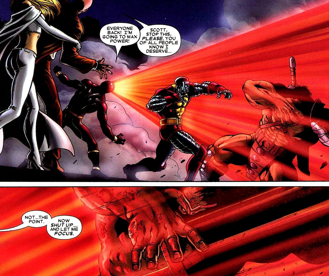 Controlar sus explosiones de conmoción es una lucha continua para Cyclops. Si bien ha adquirido cierto grado de dominio sobre ellos, gracias en parte a los esfuerzos de telépatas como Jean Grey y Emma Frost, así como a su propio entrenamiento, todavía depende en gran medida del cuarzo rubí en su visor para mantenerlos a raya. Hay pocas ocasiones en las que los usa en todo su potencial, sin embargo, las explosiones ópticas de Scott son capaces de derribar un Sentinel y arrasar un bosque con una sola mano, como se ve en Asombrosos X-Men #8 de Joss Whedon, John Cassaday, Laura Martin y Chris Eliopoulos. Cuando está lo suficientemente motivado, generalmente para proteger a otra persona, los guantes (y la visera) se quitan. Su poder es aún más impresionante una vez que los fanáticos toman en cuenta el estado de Hulk mientras lucha contra los X-Men.
