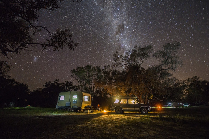 Camping con una caravana y un vehículo de cuatro ruedas estacionado bajo un árbol junto al río Darling en Australia.