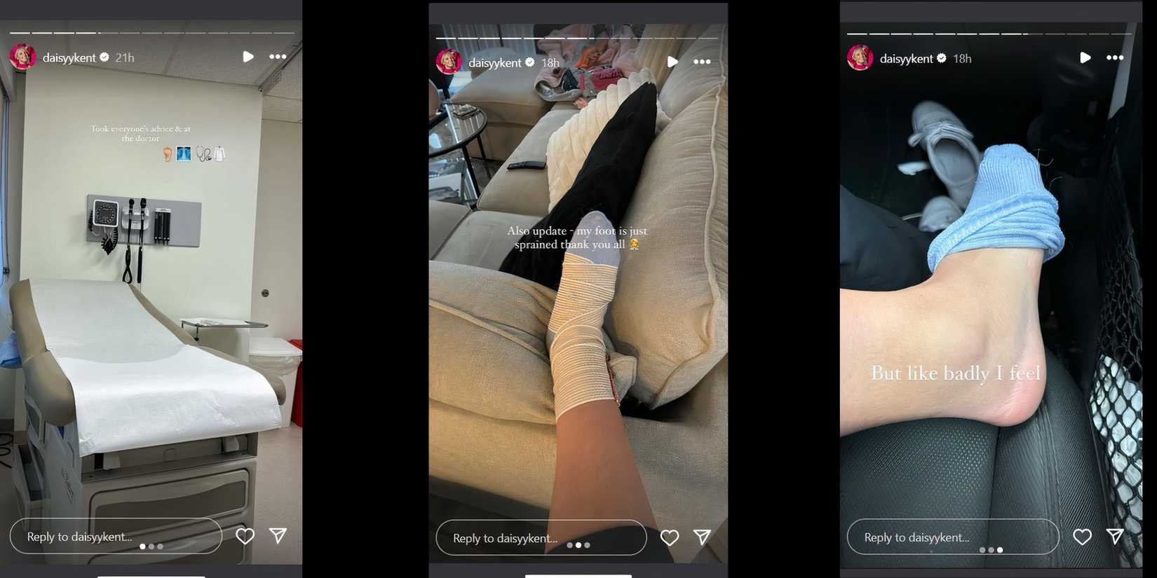Daisy luego informó que su pie estaba “Simplemente torcido.” Compartió una foto de su pie derecho envuelto en una venda. Sin embargo, Siguió con otra foto de su pie con el calcetín levantado.con el título, “Pero me siento muy mal”.