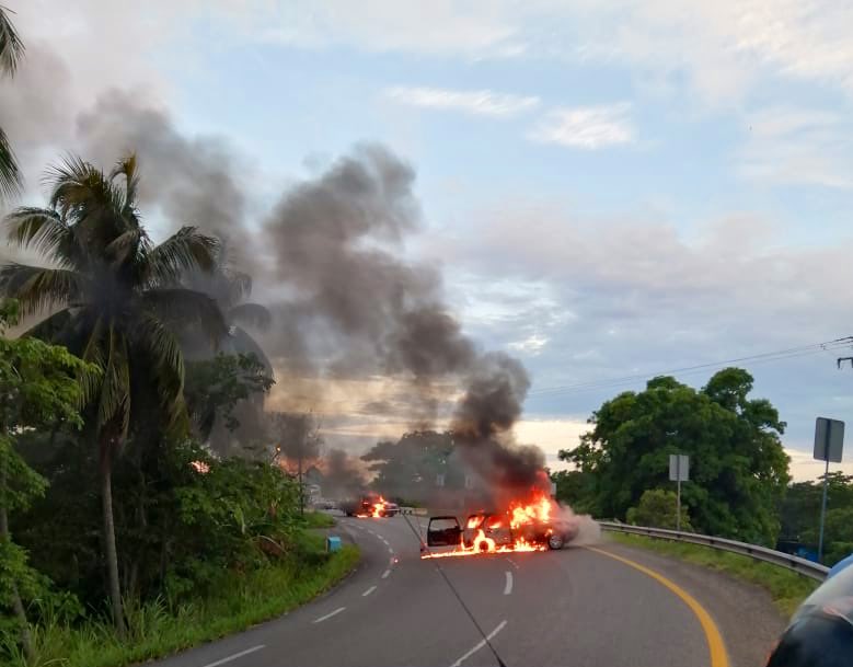 Incendian automóviles en la vía Teapa – Villahermosa Tabasco, y dejan narcomensaje dirigido a la Guardia Nacional, la circulación se encuentra detenida desde hace más de una hora. pic.twitter.com/VcpjRTJSHo