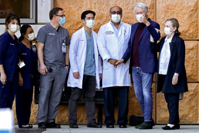 Salió del Centro Médico Irvine de la Universidad de California acompañado de su esposa, la exsecretaria de Estado y candidata presidencial demócrata en 2016, Hillary Clinton, quien saludó con la mano antes de que la pareja partiera en una caravana de vehículos.