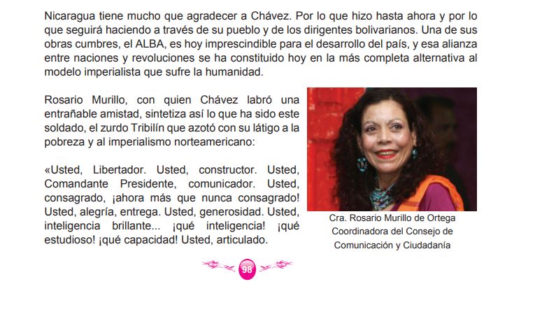 Las críticas no hacen mella en el esfuerzo gubernamental por proyectar a la familia presidencial. Otro ejemplo es la vicepresidenta Rosario Murillo. Los capítulos del texto de segundo grado de Convivencia y Civismo y el de décimo grado de Estudios Sociales son encabezados por imágenes de los Árboles de la Vida, que son estructuras metálicas de 21 metros que forman parte del ornato de Managua y que se atribuyen a la voluntad de la funcionaria. También se destaca junto a nombres como la premio nobel de la Paz Rigoberta Menchú, la ex presidenta de Brasil Dilma Rouseff y la exmandataria de Chile, Michelle Bachelet. La nueva historia económica de Nicaragua es tan autorreferencial que se destaca la “entrañable amistad” de Murillo con Hugo Chávez, a quien ella escribió unas líneas como homenaje que son reproducidas en el libro de octavo grado de estudios sociales.