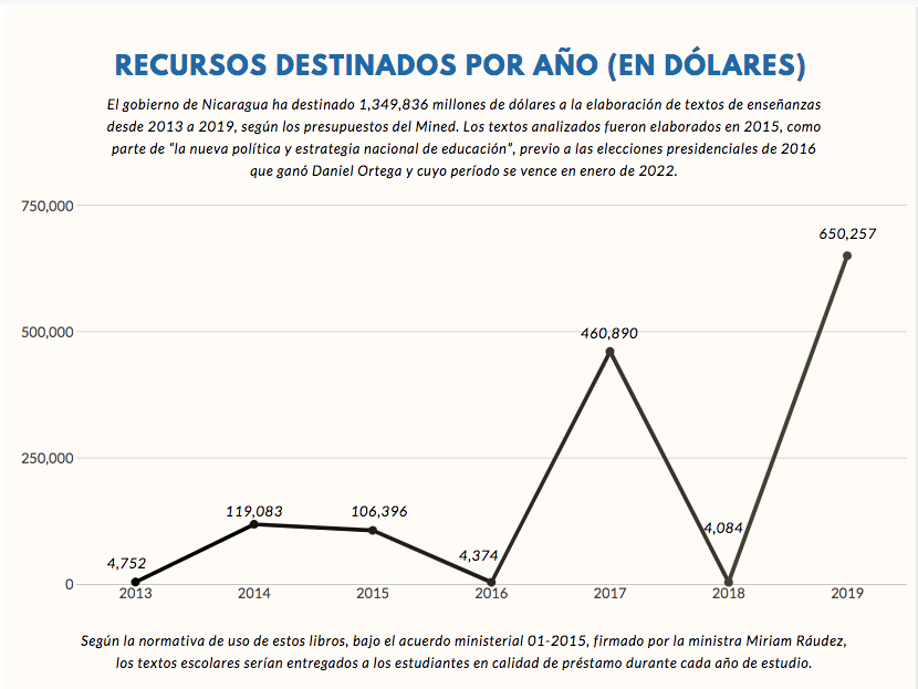 Esta investigación de NICARAGUA.CONNECTAS , la nueva iniciativa para conversar sobre lo que pasa en el país centroamericano, descubrió que en la Nicaragua de hoy, no solo es que se mencione a la familia presidencial en estos textos escolares, sino que el Ministerio de Hacienda y Crédito Público presupuestó para la elaboración de los mismos en 2019 un total 650,257 dólares. Desde 2013 hasta la fecha, la inversión en este rubro ha sido de 1.3 millones de dólares. La publicidad estatal es mostrada además en los murales de los colegios, junto a la figura del poeta Rubén Darío. En el mismo espacio se exalta también a mártires del partido de gobierno, entre ellos Carlos Fonseca, el fundador del FSLN; el hermano de Ortega, Camilo, y al poeta sandinista Leonel Rugama, mientras la bandera rojinegra es colocada siempre a la par de la azul y blanco como si una fuese la sombra de la otra.