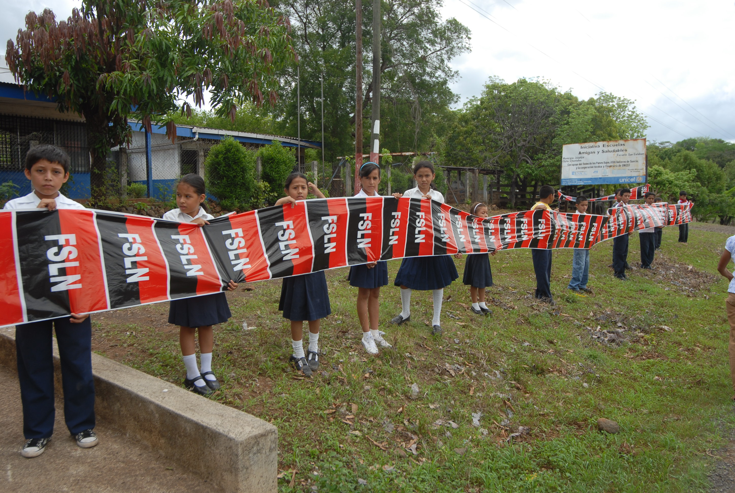 El 17 de mayo en varios colegios del país se celebró el natalicio del general Augusto C. Sandino, en quien se inspiró el partido de gobierno. Ese día, en el colegio público que lleva su nombre en Ciudad Sandino, una ciudadela en el oeste de Managua, la directora Mayra Bermúdez en medio de una cancha de basquetbol gritaba frente a un micrófono “viva a Sandino”, mientras los estudiantes a su alrededor respondían “viva”. Con la mano derecha en alto, la profesora seguía “Viva el comandante Daniel Ortega”, y los alumnos contestaban “viva”. En el centro del lugar, con el bullicio alrededor, dos niños seguían sosteniendo la bandera del partido en el poder.