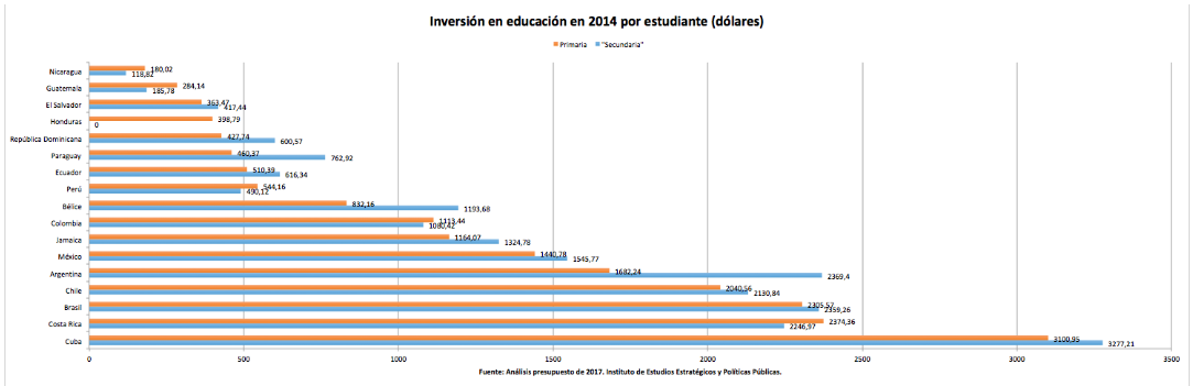 El discurso político, que se encuentra de manera subrepticia en las aulas, va dirigido a casi un millón y medio de estudiantes y sus familias en un país con índices de analfabetismo que hasta hace tres años llegaba al 15.8 por ciento. Además el gobierno invierte 118.82 dólares por estudiante de secundaria y 180 dólares por alumno de primaria, cuando en países como Costa Rica alcanza hasta 2,246.7 dólares por cada joven. Es decir, los costarricenses invierten 19 veces más por cada niño, según datos del Banco Mundial hasta 2017.
