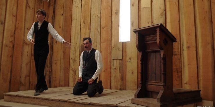 Aún así, el agnóstico Plainview se arrodilla ante el domingo en su iglesia recién construida, donde el domingo le provoca un ataque de gritos. Esta escena muestra que Plainview y Sunday no son muy diferentes, ya que la codicia y la prosperidad son más importantes para ambos que cualquier otra cosa.