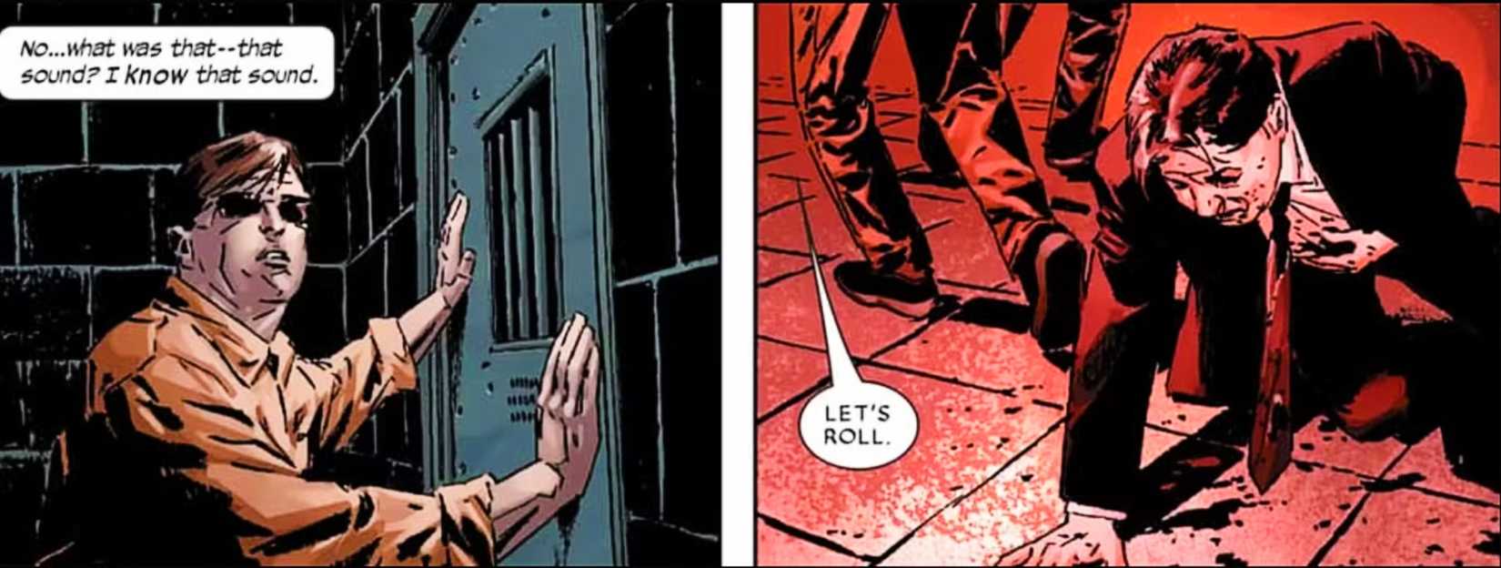 Del mismo modo a cómo Daredevil: Nacido de nuevo Posiciones Daredevil en una azotea sobre la escena del asesinato de Foggy, incapaz de hacer nada más que escuchar los latidos de su amigo en silencio, en la historia de Brubaker, Matt está atrapado detrás de las paredes de ladrillo con solo un pequeño marco de bar en la parte delantera. Todo lo que puede hacer es escuchar a los asaltantes de Foggy impotentes mientras su mejor amigo muere al otro lado de la puerta. Mientras traumatiza a Matt, llevándolo por un camino que incluiría unirme al Punisher para organizar un descanso en la prisión, Había más en la historia de lo que conocí a los ojos.