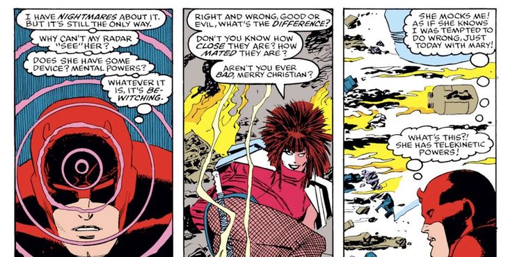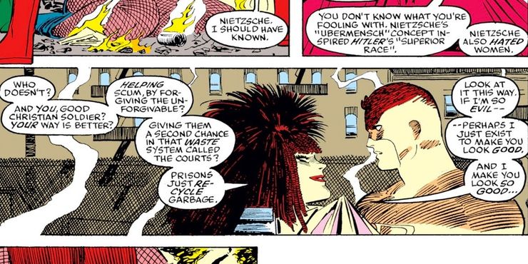 Mientras la fiebre tifoidea y Daredevil luchan, ella cita a Nietzsche, provocando el disgusto de Daredevil cuando menciona que el filósofo “odiado mujeres”. Sin inmutarse, la fiebre tifoidea dice: “¿Quién no? ¿Y tú, buen soldado cristiano? ¿Tu camino es mejor? …Míralo de esta manera. Si soy tan malvado, tal vez solo existo para hacerte ver bueno. Y te hago mirar tan bueno…” Aquí, Typhoid se burla del marco moral católico al que Daredevil se aferra desesperadamente, a pesar de que sus acciones tanto como Daredevil como Matt Murdock van rutinariamente en contra de las enseñanzas de la iglesia. Aunque nunca declara explícitamente que ella es “malvada”, Typhoid dice que ” tal vez solo existo para hacerte lucir bien” revela cómo el tropo de femme fatale se ha enredado moralmente dentro del género de los superhéroes.