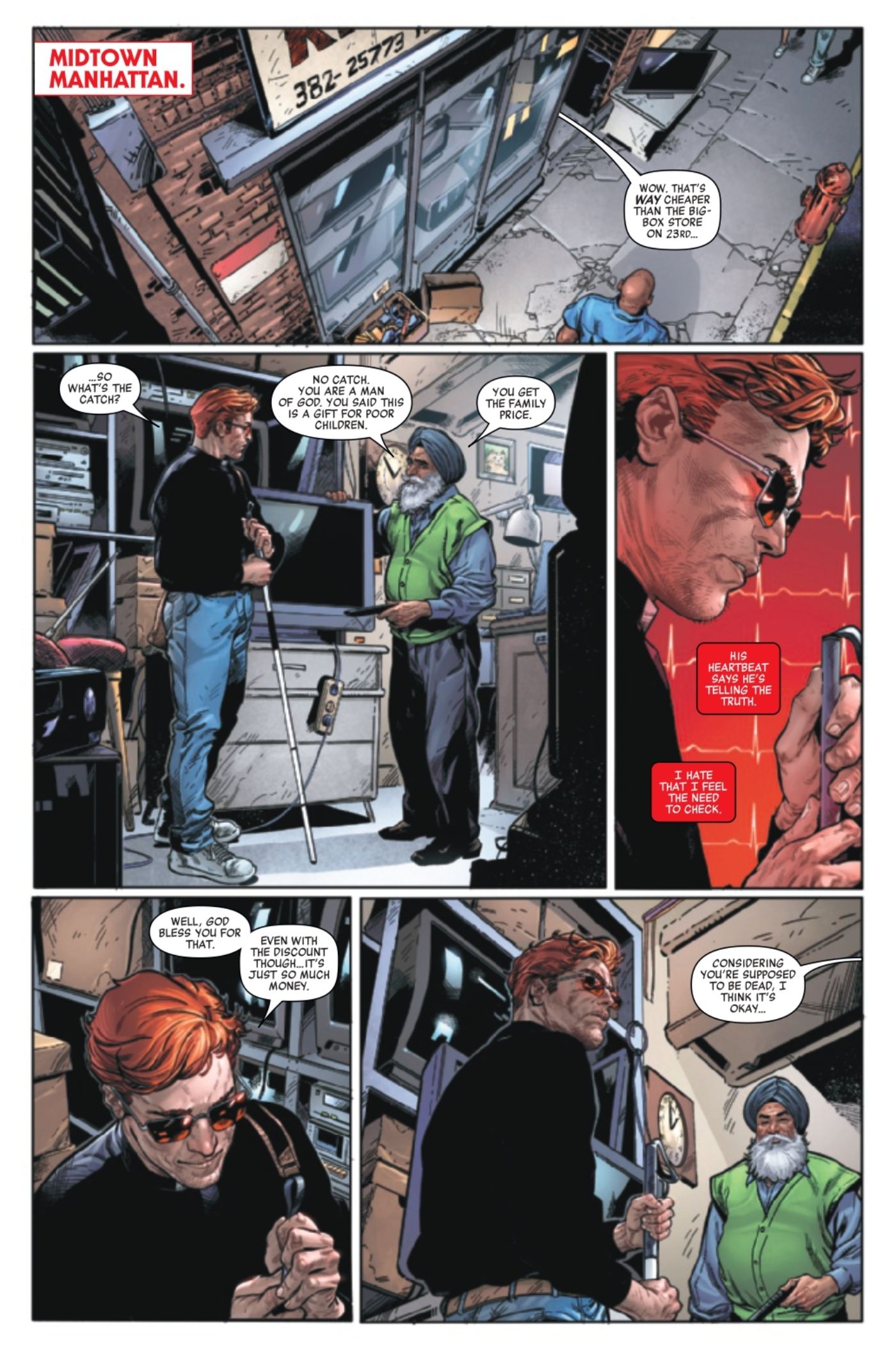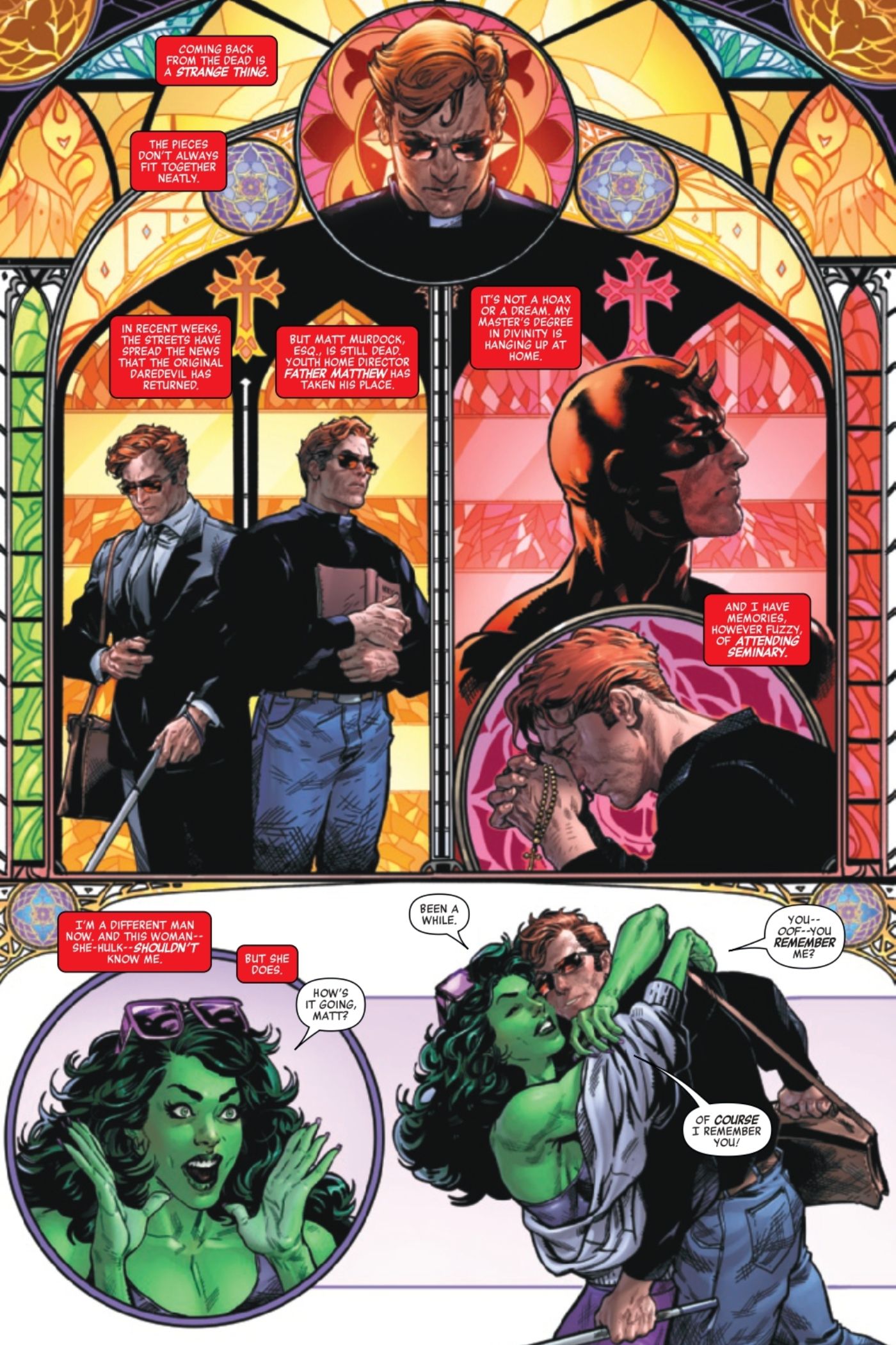 - Matt Murdock, ahora sacerdote, se encuentra con She-Hulk en una tienda, lo cual resulta incómodo para él debido a los diferentes recuerdos de su vida renacida.