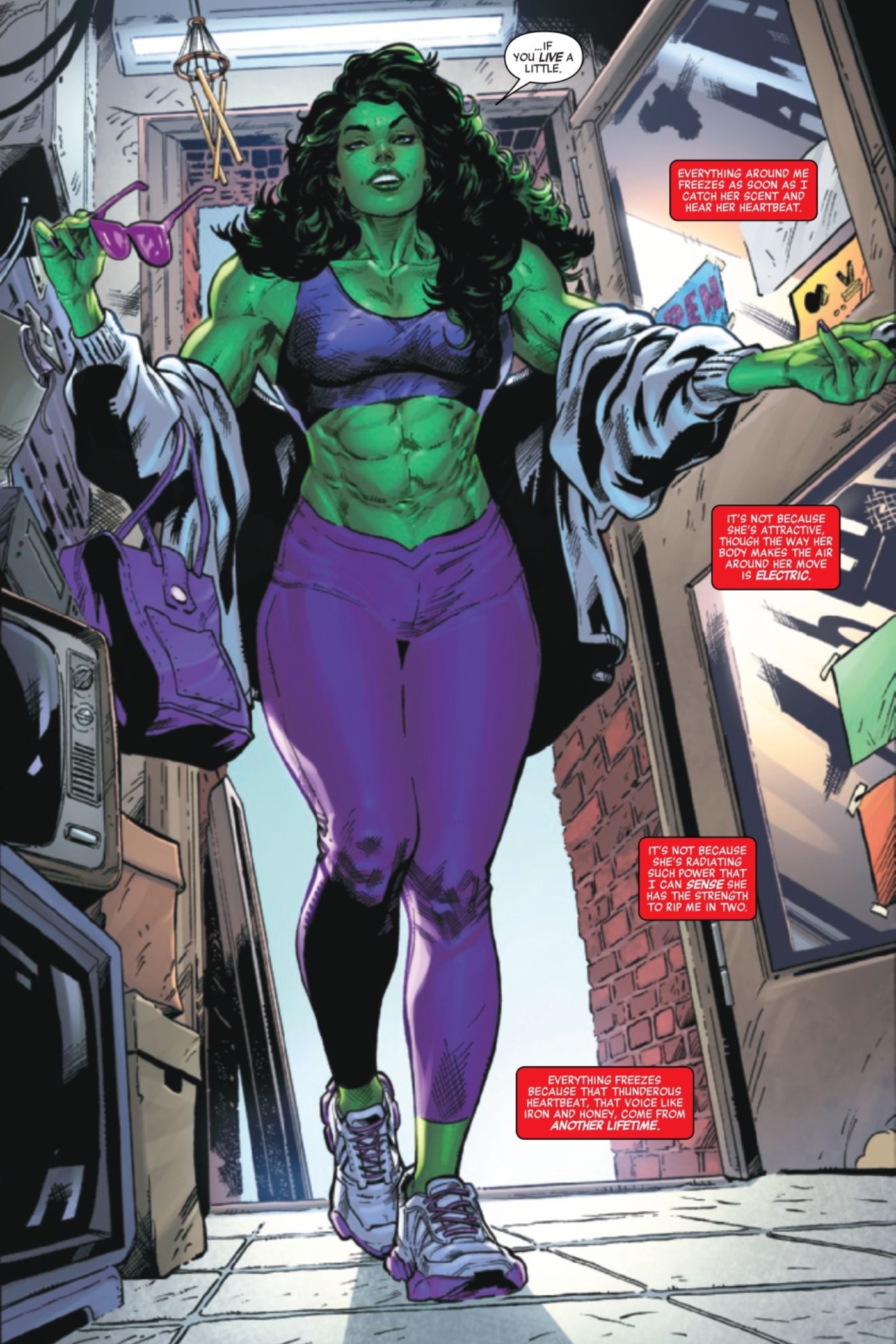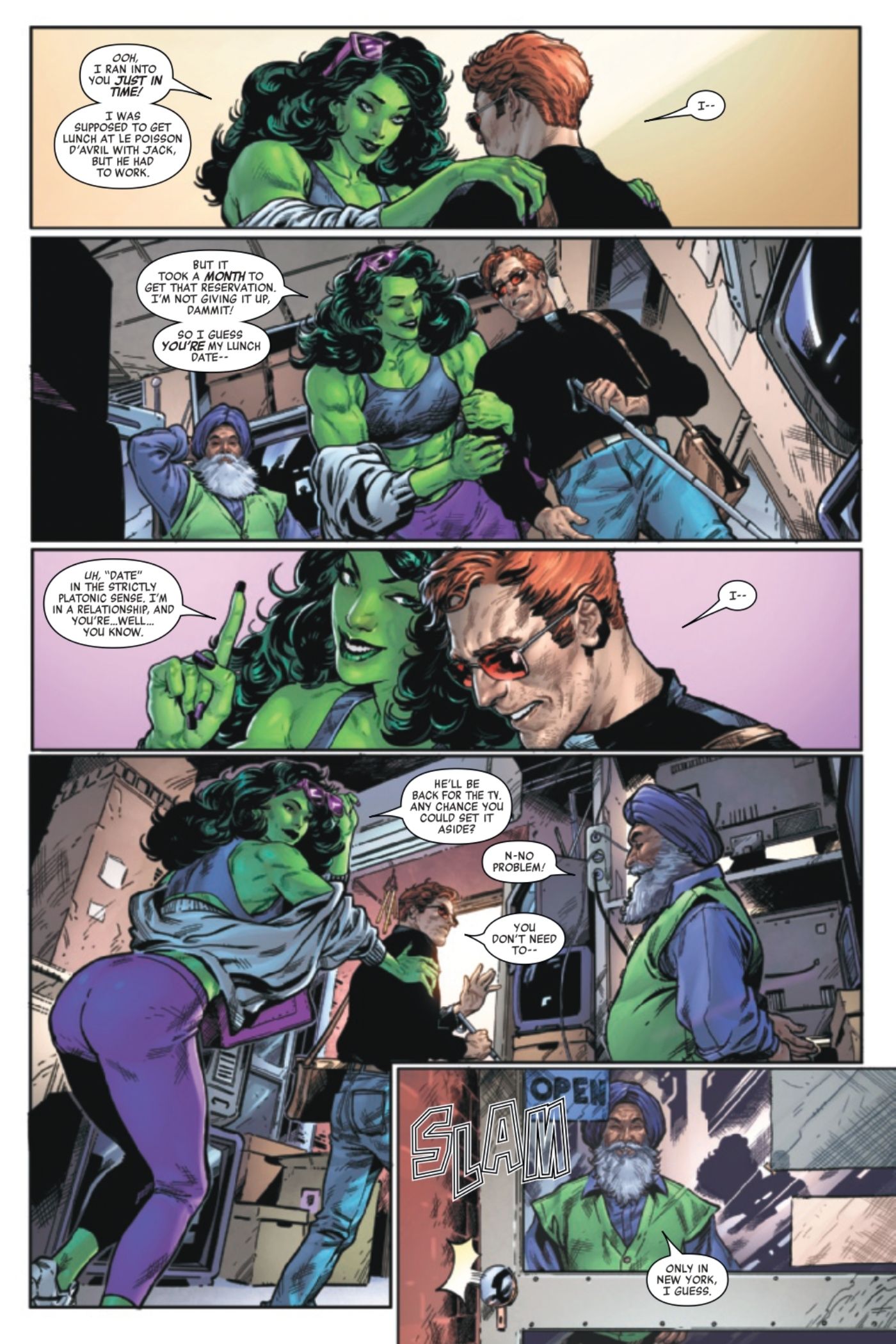 “/> She-Hulk ve a Matt en la tienda e inmediatamente lo abraza como si fueran viejos amigos poniéndose al día, porque, para Jennifer, son viejos amigos. Los recuerdos de Matt de la vida en la que renació le dificultan reconciliar la vida que lo conocen quienes lo rodean. El padre Matthew no tenía motivos para conocer a She-Hulk, ni ella a él. Sin embargo, aquí están, hablando como viejos amigos, haciendo planes para ir a almorzar juntos. Si bien la portada de este número muestra a She-Hulk y Daredevil con una energía mucho más agresiva y distante entre ellos, la vista previa simplemente hace que su encuentro parezca incómodo y unilateral.