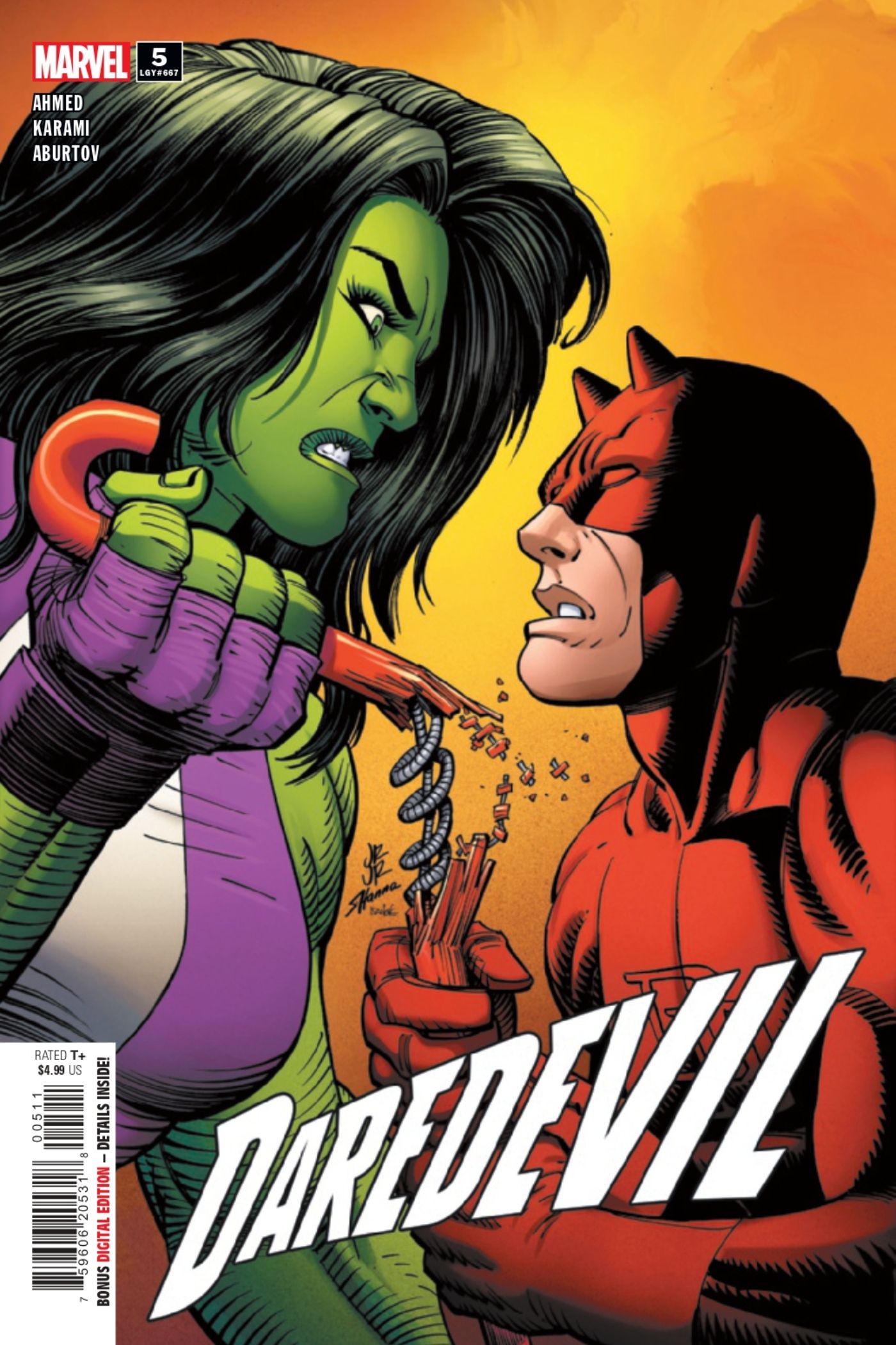 En un adelanto de Temerario #5 de Saladin Ahmed y Farid Karami, Matt Murdock (que ahora es sacerdote, el padre Matthew) está comprando un televisor en una tienda local para su centro juvenil. Esta serie tiene lugar después de que Daredevil sacrificara su vida para salvar las almas de sus amigos y su posterior resurrección. Si bien sigue siendo el mismo chico, Matt recuerda haber vivido una vida totalmente diferente a la que llevó originalmente, razón por la cual ver a She-Hulk fue tan alarmante para él.