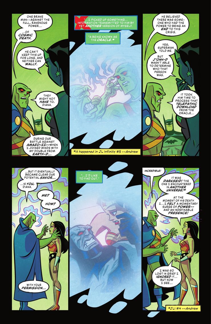 La Liga de la Justicia está tomando su posición final contra Amazo-II, quien ha destruido totalmente el multiverso. Mientras los héroes flotan en la nada, Martian Manhunter le dice a Wonder Woman que ha estado en contacto con otra versión de sí mismo, quien le dice que Wonder Woman tiene la clave para reiniciar el universo. Ella se da cuenta de que cuando él murió, Darkseid le impartió la “Ecuación de la vida”, que los héroes usan para restaurar el multiverso y derrotar a Amazo-II de una vez por todas.