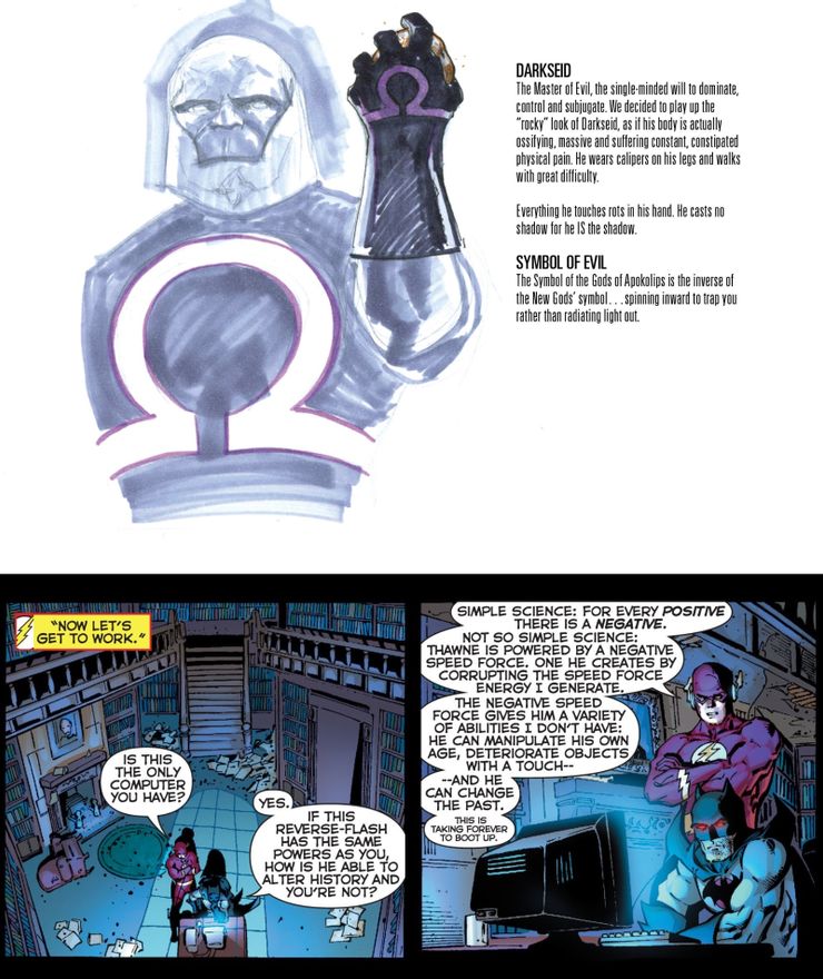 Durante las páginas finales de Final Crisis, Grant Morrison detalla algunas notas sobre sus pensamientos sobre Darkseid. Comenta que todo lo que toca el tiránico líder de Apokolips “se pudre en su mano”. Si bien los métodos para hacerlo son diferentes a los de Darkseid, Reverse-Flash también puede desintegrar la materia. Durante Punto de inflamabilidad, Barry revela que Eobard puede “deteriorar los objetos con un toque”, una habilidad otorgada por el “Fuerza de velocidad negativa”. Curiosamente, Darkseid y Reverse-Flash tienen estas habilidades superpoderosas pero rara vez las usan.