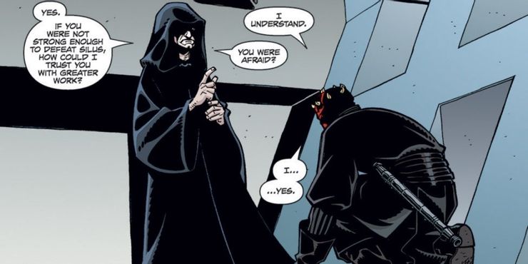 Esta no es la única vez que Palpatine ha engañado a Darth Maul haciéndole creer que había sido reemplazado. La prueba final de Maul antes de alcanzar su Señoría Sith lo hizo sobrevivir a la persecución de los droides asesinos en el Borde Exterior durante un mes antes de batirse en duelo con el mismísimo Darth Sidious. Sidious afirmó que Maul ya había sido reemplazado por otro aspirante a Sith, lo que llevó a Maul a intentar matar a su maestro por primera y aparentemente única vez en su vida.