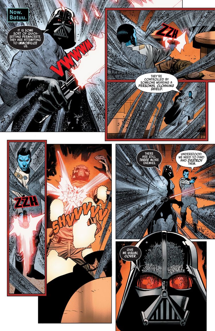 Tan pronto como Vader y Thrawn son atacados por este enjambre que rápidamente se convierte en un permacreto de secado rápido al impactar, el Señor Oscuro ordena al Gran Almirante que le proporcione cierta cobertura visual para que sus atacantes no puedan ver lo que está planeando. Vader arranca una sección de su intimidante capa negra y se la envuelve alrededor del brazo antes de que el concreto fragüe por completo. inmovilizándose tanto a él como a Thrawn. Creyendo que sus objetivos estaban atrapados e indefensos, los asesinos Darshi se acercaron para recoger a sus presas.