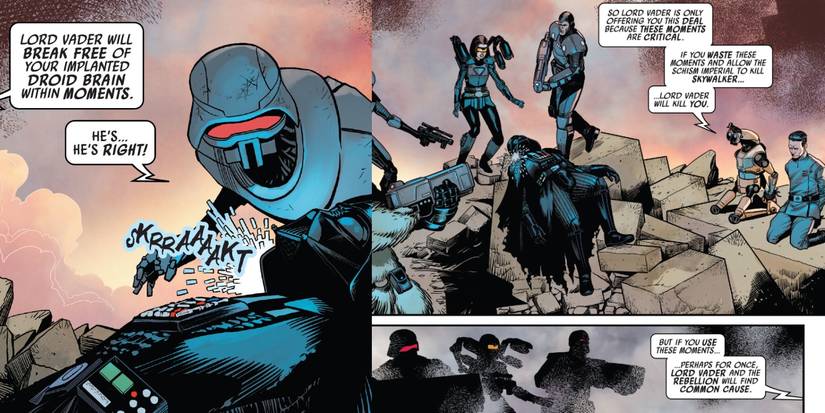 Después de haber reunido fuerzas en un último intento por derrocar a Palpatine, Darth Vader se había aliado con el Cisma Imperial. Sin embargo, el Cisma finalmente traiciona a Vader en el nuevo Darth Vader #49 por Greg Pak y Raffaele Ienco, dejándolo a merced del Cuerpo MAR de la Rebelión, un escuadrón de cyborgs que Vader había reprogramado con cerebros de droides (dejándolos sin otra opción que servirle). Recién liberados, el Cuerpo MAR tiene la intención de hacer lo mismo con Vader mientras el Cisma abandona el planeta para destruir a Luke Skywalker. obligando a Vader a proponer una tregua sorprendente por el bien de su hijo: