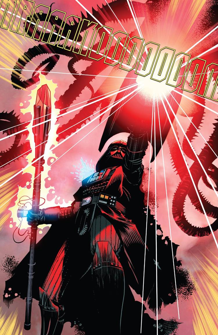 Como se ve en este nuevo número, el Sith Eterno, destrozado y derrotado, convocó a una manada de criaturas del espacio profundo conocidas como Summa-verminoths, criaturas gigantescas con tentáculos que residen en la cercana Red Honeycomb Zone, una red de anomalías hiperespaciales que actúan como una barrera natural. que durante mucho tiempo había ocultado el mundo Sith de Exgol del resto de la galaxia. Sin embargo, los bichos Summa y sus letales ataques psíquicos demostraron no ser rival para Vader, quien viaja encima de su Lanzadera Imperial antes de disparar una explosión masiva de energía kyber roja a los monstruos parecidos a kaiju reunidos.