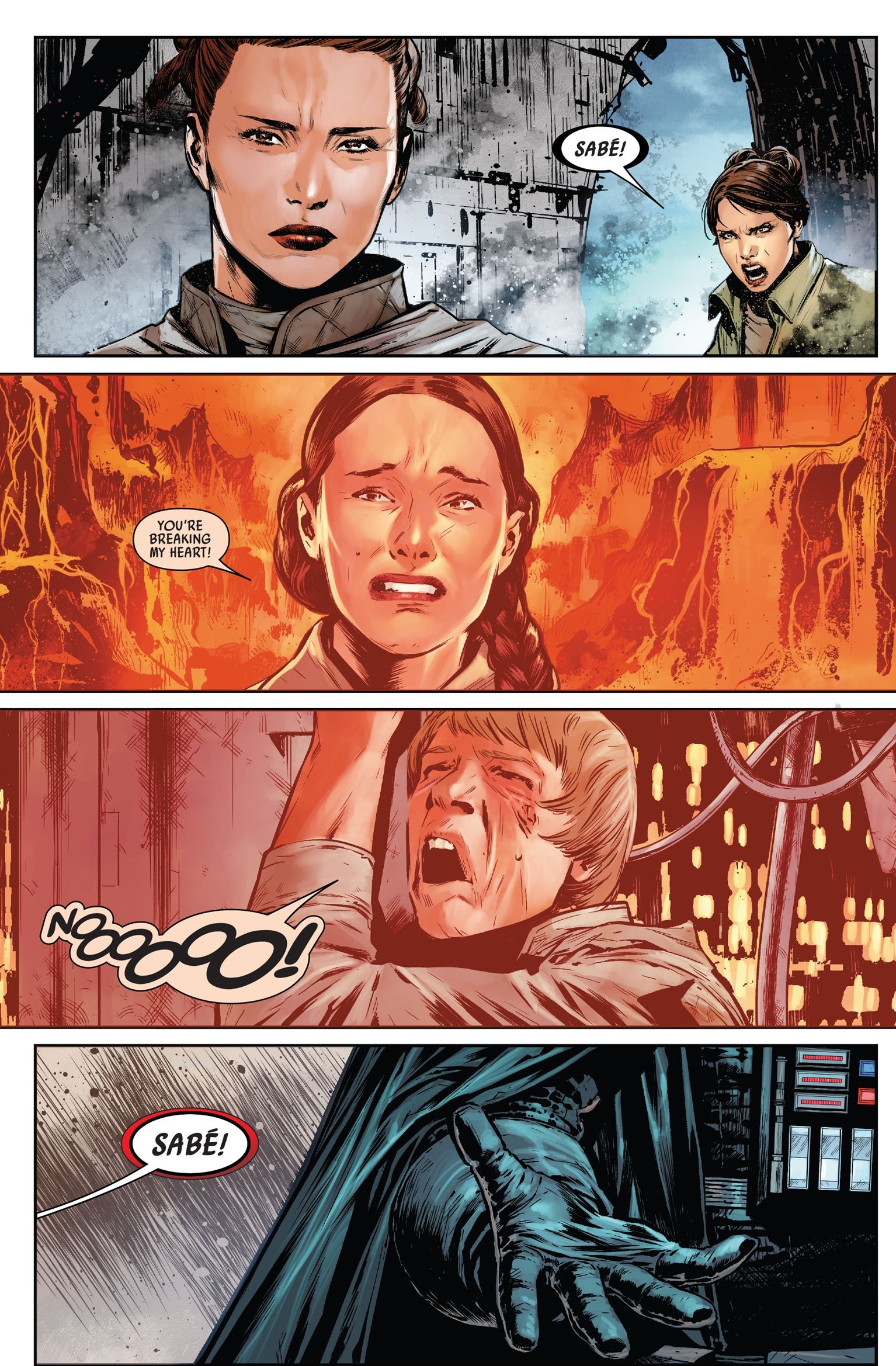 Por supuesto, Marvel no le da por completo ese momento porque las hermanas de Sabé la alejan y escapan antes de que pueda tomar su mano. Aunque Sabé finalmente abandona a sus hermanas por Vader de la manera más dramática imaginable, su retiro involuntario de él evita que la realidad preferida de Vader realmente concluya. Dado que ella nunca pone su mano en la de él, tampoco Luke ni Padmé pueden hacerlo en los recuerdos reimaginados. El hecho de que Vader ni siquiera pueda realizar una fantasía en su propia cabeza es devastador, a pesar de que finalmente obtiene lo que quiere al final del problema. Esta fantasía rota se refleja aún más en el mundo real cuando Sabé luego le dice a Vader que su decisión de unirse a él es similar a perder su alma. Sabé no está tomando con gusto la mano de Vader como lo están Padmé y Luke en su versión alterada de los eventos de las películas. Lo está haciendo a regañadientes.
