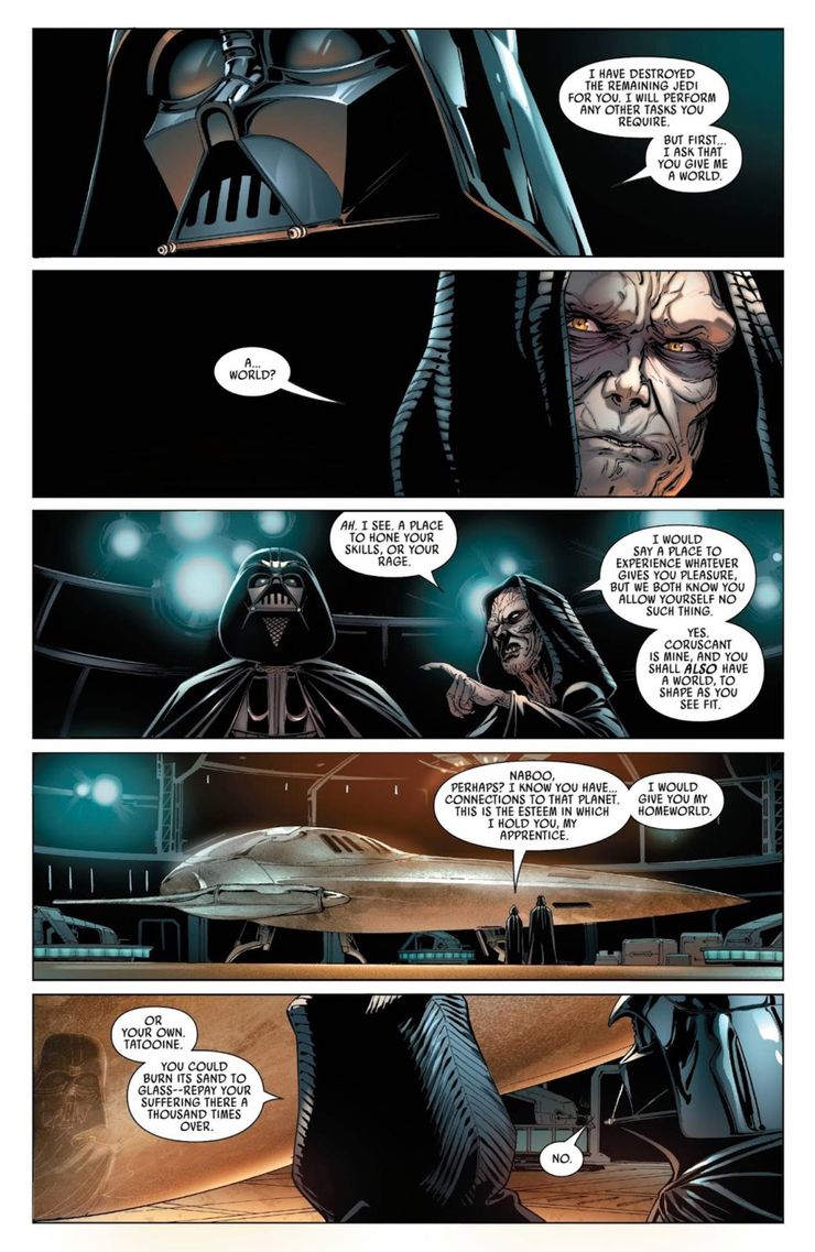 Cuando La amenaza fantasma reveló que Darth Vader había crecido como Anakin Skywalker en Tatooine, hizo que los fanáticos se preguntaran por qué Obi-Wan Kenobi habría escondido a Luke en el planeta desértico. Tatooine debería haber sido un lugar que el Imperio probablemente monitorearía, con Vader específicamente vigilando de cerca su mundo natal. Sin embargo, el planeta se deslizó bajo el radar del Imperio, con Vader eligiendo descuidar su pasado como Anakin. Independientemente, una vez se enfatizó que los Sith deberían haber localizado a su hijo mucho antes de lo que lo hizo en la trilogía original. En Darth Vader # 20 (2017) escrito por Charles Soule con arte de Giuseppe Camuncoli, Darth Vader causa estragos en Coruscant y, en consecuencia, el emperador Palpatine lo envía fuera del mundo. Sin embargo, Palpatine le dice a su compañero Sith que está satisfecho con el caos que ha traído al planeta. En respuesta, Vader solicita que debería tener su propio mundo para él solo.