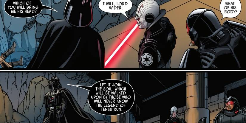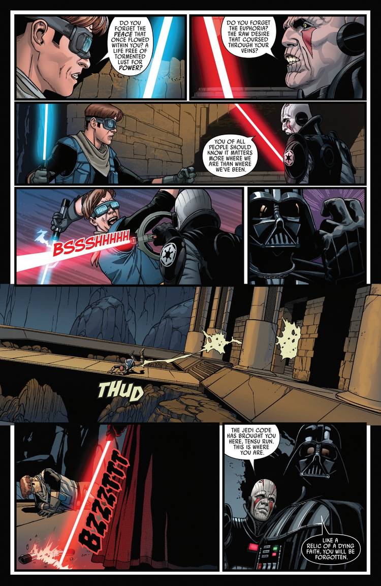 Al matar a un Tensu Run maltrecho y golpeado con un movimiento oscuro de su sable de luz, Darth Vader asesina personalmente al propio Tensu Run al final de este número final antes de ordenarle al Gran Inquisidor que recupere su cabeza. Sin embargo, Vader ordena que el cuerpo permanezca donde yacía para que el resto de la galaxia finalmente olvide la leyenda y el legado de Tensu. actualmente bajo el dominio y control opresivo del Imperio. Con ese fin, la siniestra victoria de Darth Vader en este número es una de sus batallas Jedi más rápidas y, al mismo tiempo, una de las más brutales, ya que ha desatado tanto su mando del lado oscuro como a sus Inquisidores con poder y fuerza letales.