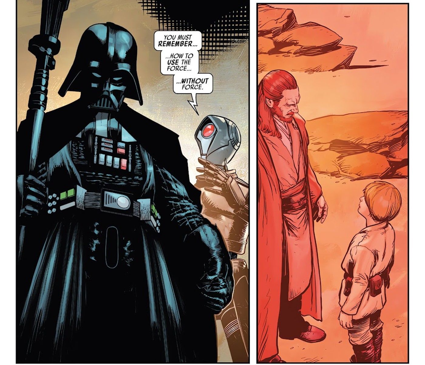El interludio del lado luminoso en Darth Vader El número 37 es breve, ya que los recuerdos de Vader sobre Qui-Gon rápidamente se convierten en los de Obi-Wan Kenobi, la serenidad se convierte en una ira desatada, que Vader desata en el mundo material. Sin embargo, este breve interludio de paz para los agonizantes Jedi caídos confirma que Qui-Gon Jinn, único entre los miembros de su antigua Orden, es recordado con cariño y, además, respeto por el Señor Oscuro de los Sith. Los Sith tratan con absolutos, por lo que el odio de Vader hacia los Jedi debería ser absoluto. En sus recuerdos de Qui-Gon Jinn, Vader revela quizás su única excepción a esta regla que de otro modo sería inviolable.