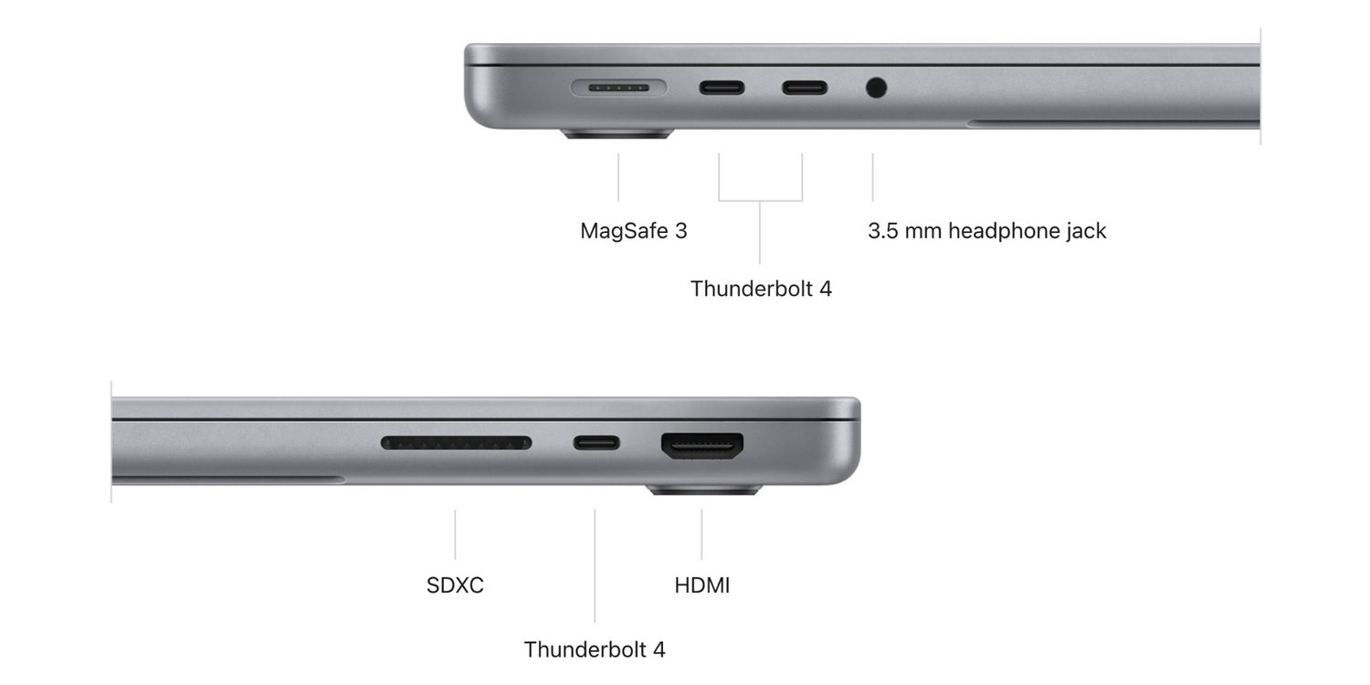 Debajo del capó, el portátil funciona con uno de los conjuntos de chips más potentes de Apple, el M2 Pro. Tiene una CPU de 10 núcleos, una GPU de 16 núcleos y un motor neuronal de 16 núcleos. Combinado con la memoria unificada de 16 GB y el almacenamiento SSD de 512 GB, la computadora portátil puede manejar flujos de trabajo exigentes. La MacBook Pro cuenta con varios puertos, incluida una ranura SDXC, un puerto HDMI, un conector para auriculares de 3,5 mm y un puerto MagSafe 3. También tiene tres puertos Thunderbolt 4 (USB-C) que se pueden usar para cargar, conectar a monitores externos y transferir datos. El portátil cuenta con Wi-Fi 6E y Bluetooth 5.3.