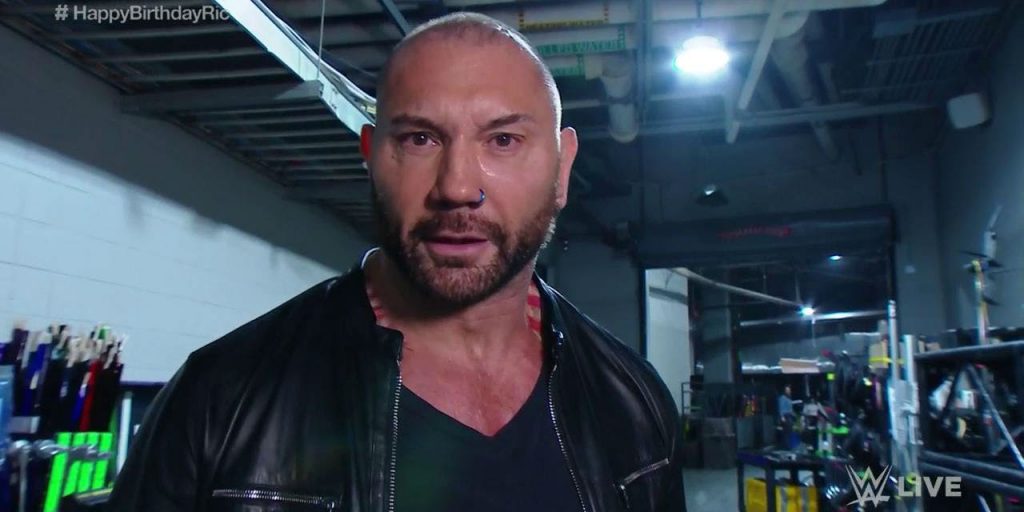 Multi-tiempo WWE El campeón y actor MCU Dave Bautista regresa sorprendentemente a la WWE Crudo, y procede a derrotar a Ric Flair en su 70 cumpleaños. Bautista, que lucha en la WWE simplemente como Batista, se hizo famoso por ser parte de la facción Evolución a principios de la década de 2000, junto a Triple H, Ric Flair y Randy Orton. Para el 2005, Bautista había activado el grupo, y pasó a derrotar a HHH por el campeonato mundial de peso pesado en WrestleMania XXI. Bautista siguió siendo un jugador del evento principal hasta que dejó WWE en 2010 después de perder una enemistad con John Cena.