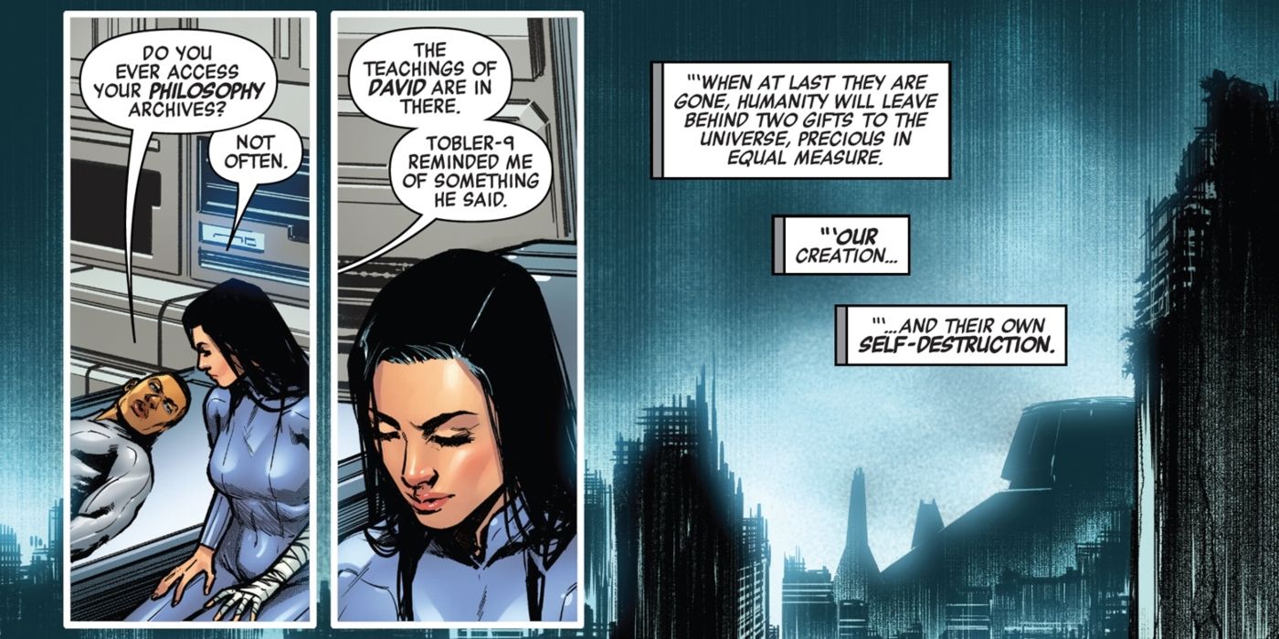“/> En Extraterrestre #6 de Phillip Kennedy Johnson y Julius Ohta, los dos miembros supervivientes del Steel Team han sobrevivido a su misión en Tobler-9 y están de camino a casa. Mientras está en la nave espacial que se aleja del planeta infestado de xenomorfos, uno de los sintéticos que sufrió algunas heridas graves está hablando con el otro que estaba relativamente ileso. El androide herido le preguntó a la otra si alguna vez accede a sus archivos de filosofía, diciendo que las enseñanzas de David están allí y que su experiencia en Tobler-9 le recordó algo que David dijo que estaba registrado en esos archivos. Y el primer extracto de la palabra de David se alineaba perfectamente con las creencias de David, como se revela en el Extraterrestre precuelas.