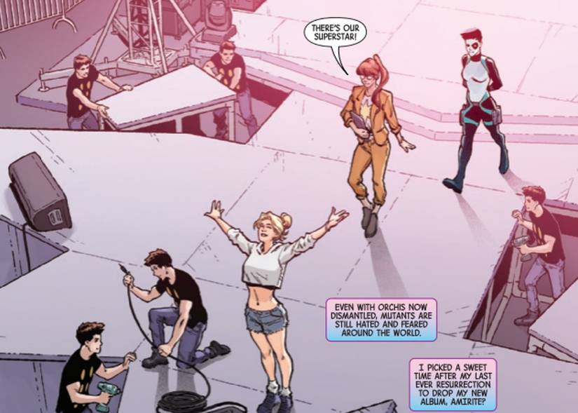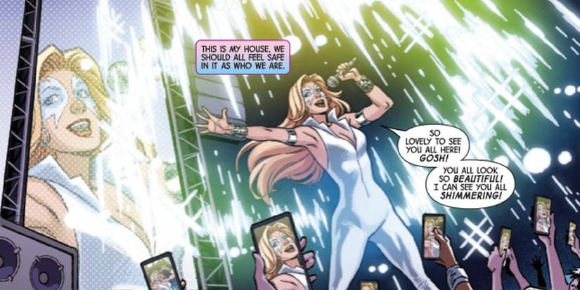 Las cosas empeoran cuando la vil Scorpia ataca a Dazzler en el escenario durante su actuación. Finalmente, neutraliza a la supervillana, pero la política mutante es un gran problema que hay que ignorar cuando Dazzler acaba de usar sus poderes mutantes y el inductor de imagen de Shark Girl falla frente a una multitud que agotó las entradas. Lo que sigue es La declaración de Dazzler de que está orgullosa de ser una mutante, eligiendo duplicar la idea con una canción titulada “Out and Proud”. Inmediatamente la critican en línea por impulsar una “agenda mutante” Pero esa es otra historia para otro número.