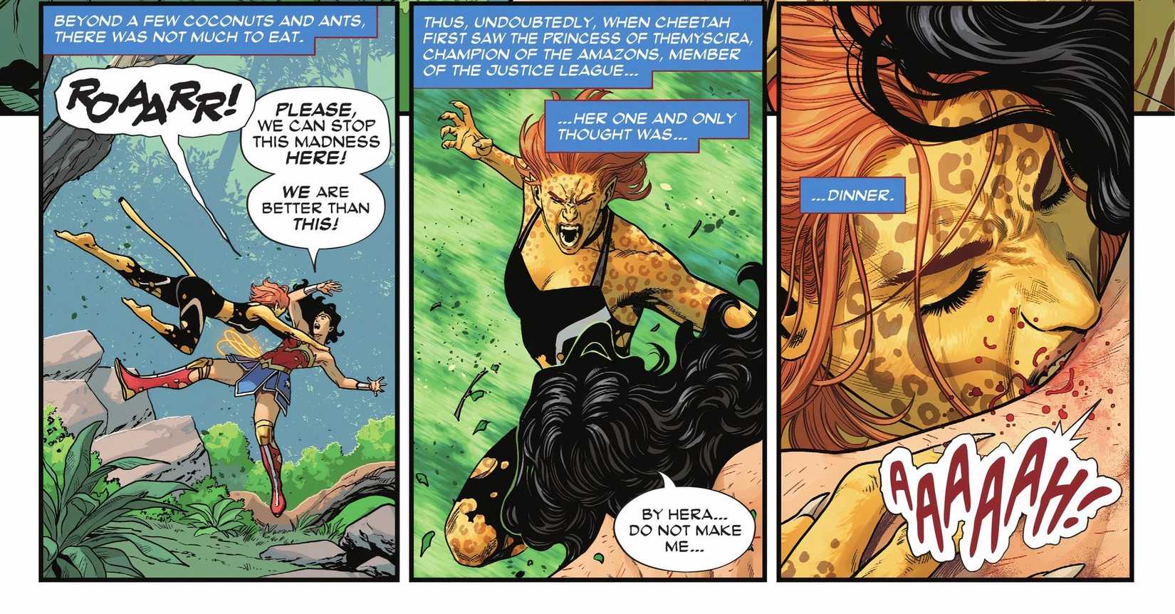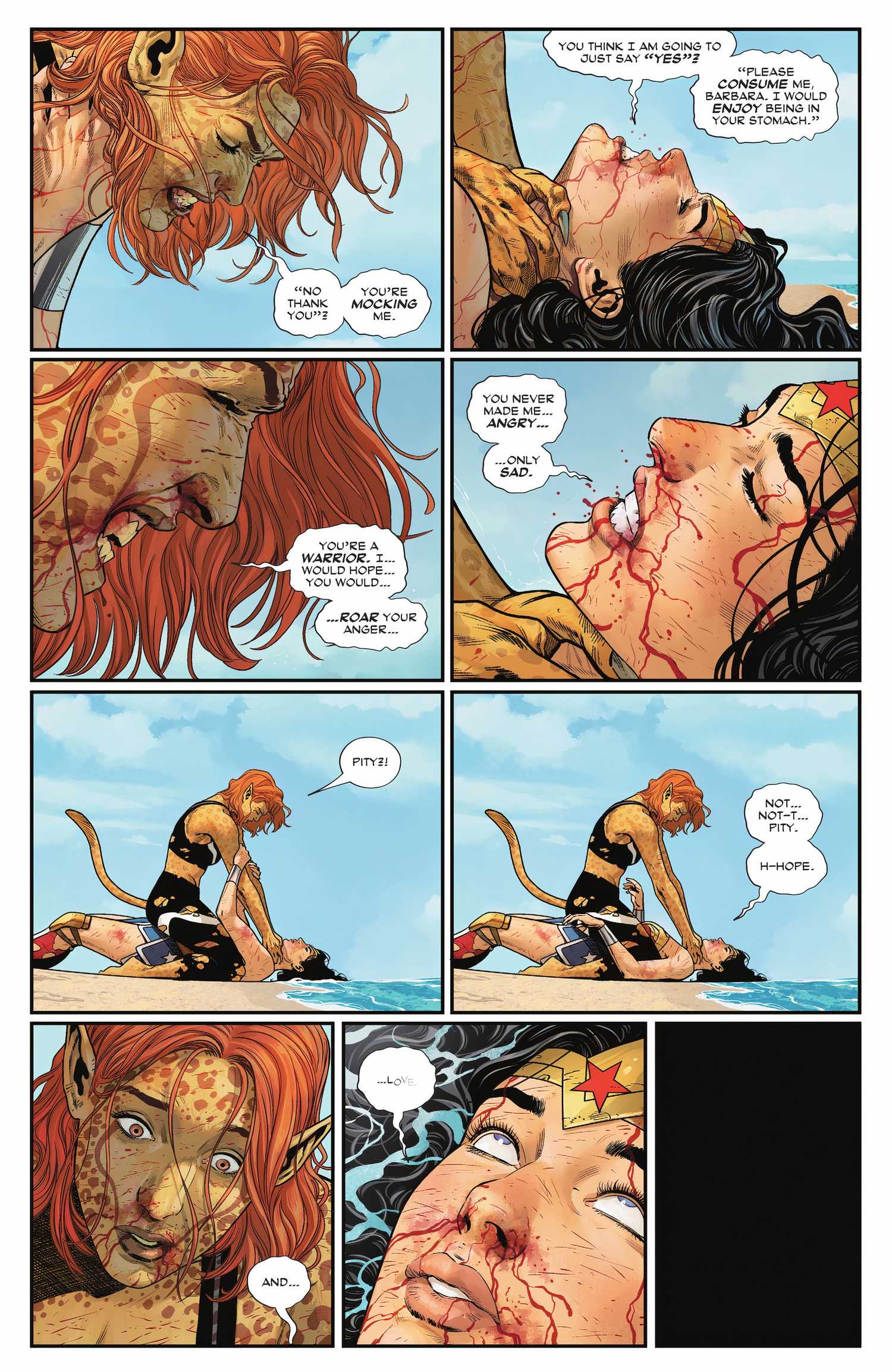 Después de desmayarse, Diana se despierta y encuentra una fogata y un guepardo que ya no intenta matarla. Alrededor de la fogata, los temas de esta narrativa de “mujeres que aman a las mujeres” realmente comienzan a elevarse. Los dos se establecen para una conversación sincera, con Barbara apoyando su cabeza en el hombro de Diana y la Amazona tomando su mano mientras discuten la lucha actual de Wonder Woman contra el Soberano y un mundo vuelto en su contra. Durante su conversación, Diana se pone a la defensiva ante las preguntas de Cheetah y dice: “¿Crees que me conoces?“A lo que Cheetah responde:”Soy el único que te conoce.“