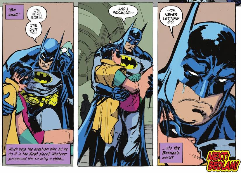 Junto con la fenomenal obra de arte de Leonardi y Renzi, que representa El Caballero Oscuro acuna el cuerpo de su hijo contra su pecho mientras una lágrima se escapa de su capucha.–Esta escena me destrozó emocionalmente. Es un momento desgarrador que muestra de manera hermosa el amor de Bruce por su hijo de una manera que se siente a la vez propia del personaje y creíble. Era todo lo que necesitaba de la dinámica entre Batman y Jason Todd y, al mismo tiempo, ofrecía lo que el dúo merecía, capturando el lado paternal de Bruce y confirmando que ve a Jason como algo más que un “Buen soldado.“El fandom necesitaba urgentemente más momentos del buen padre Bruce Wayne, y DeMatteis cumplió con creces.