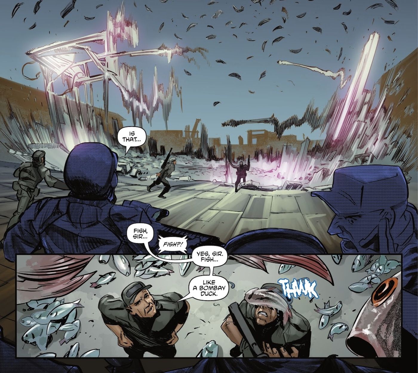 “/> Mientras incluso el brillante Castle parece sorprendido de que los poderes de Dodge puedan transportar todo el almacén donde construyeron su base, el Dr. Sankaran le pregunta si alguna vez ha oído hablar del “Teorema de la improbabilidad infinita”. Esta es una alusión directa al impulso de improbabilidad infinita de La Guía del autoestopista galáctico. El título del número, Todo el pescadoy los peces que comienzan a caer del cielo una vez que la Vigilia desaparece nos recuerdan la referencia a la serie clásica de Douglas Adams.