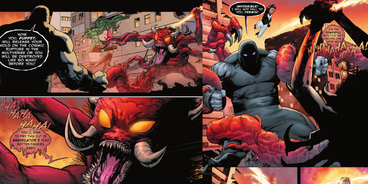 Visto al final del número cuando el Capitán Zanahoria y su tripulación están protegiendo la grieta para que no se use indebidamente, Annihilator se muestra en toda su gloria fea, y legalmente distinta, mientras golpea a estos héroes. De color rojo en lugar de gris, pero con cuernos similares y siguiendo el modelo de Violator, Annihilator toma al Capitán Carrot a la tarea y es capaz de mantenerse firme cuando Darkseid entra en la refriega. Diciendo: “¡Imposible! ¡No caeré ante ti, bicho! Darkseid está casi abrumado por Annihilator y solo es derrotado cuando Doctor Multiverse toma el poder de la grieta multiversal para sí misma, desterrando a Annihilator por el momento, pero no antes de que se demuestre que este villano de Spawn podría matar totalmente a Darkseid si alguna vez tuviera la oportunidad.