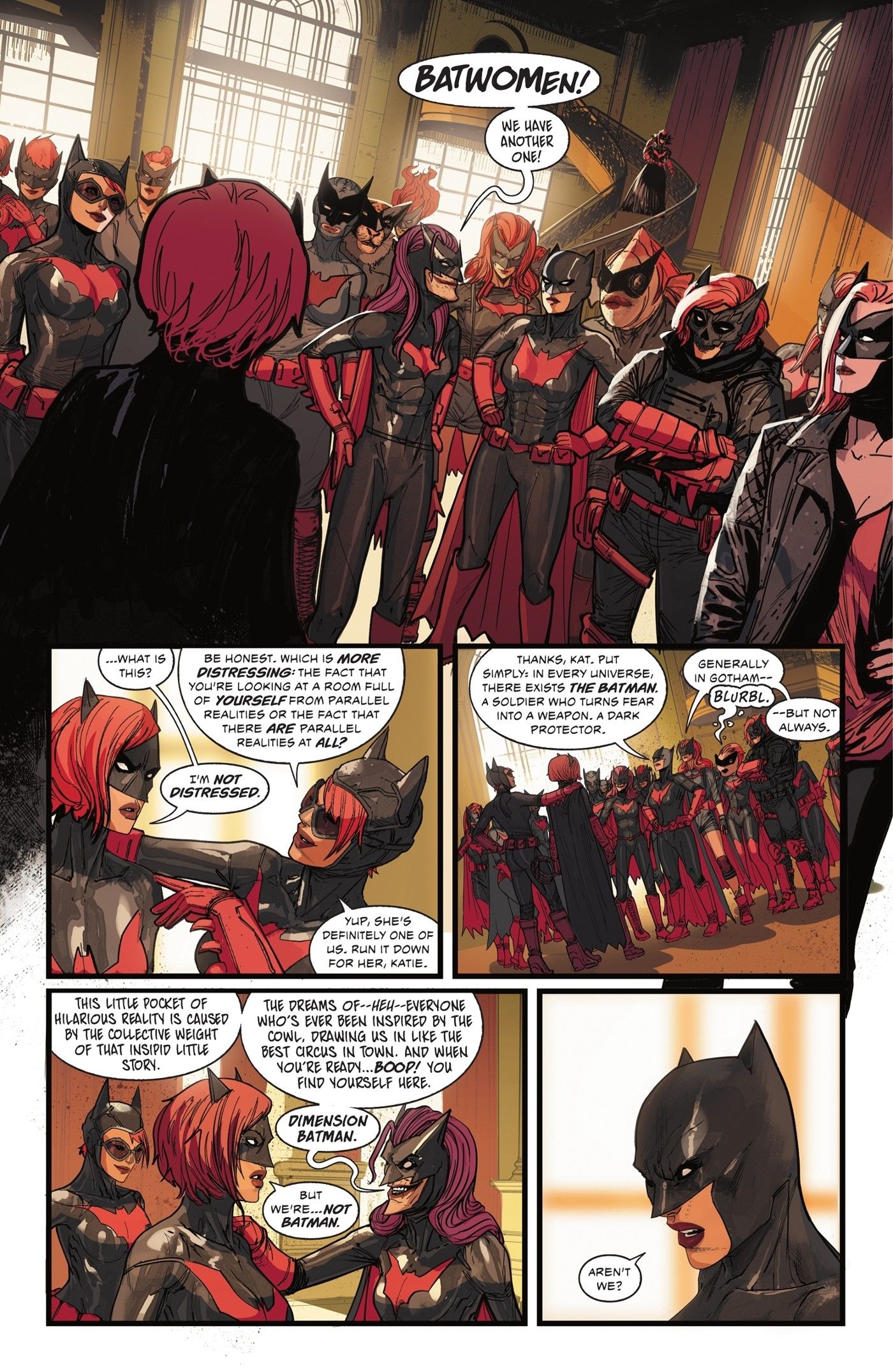 Forasteros El número 3 está escrito por Jackson Lanzing y Collin Kelly y dibujado por Robert Carey. Batwoman y Luke Fox viajan a través de una puerta de entrada a “un lugar imposible”. El dúo se encuentra en una versión de Wayne Manor inspirada en MC Escher, llena de variantes de Batman. Asimismo, Batwoman también se encuentra en una habitación con variantes de ella, y una de ellas le dice que está en “Dimensión Batman”.