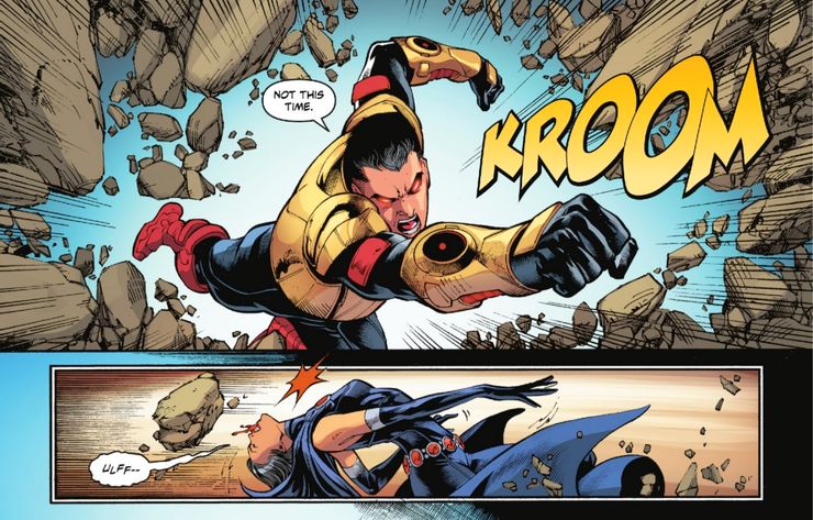 En Titanes Unidos #5 – escrito por Cavan Scott con arte de Jose Luis – Las fuerzas tamaraneanas de Blackfire se están acercando a la Tierra cuando ella envía a Black Zero para acabar con el equipo de los Titanes. El cero negro lo hace no contenerse, y es fácilmente capaz de derribar literalmente a todos los miembros del equipo, excepto a Starfire, que no se encuentra por ninguna parte durante la batalla. El trauma de Conner está en el centro de su nueva personalidad Black Zero, ya que asume que todos sus ex compañeros de equipo lo ven como un “Cero,” y un “fanático de los clones.Esta ira reprimida y el dolor que se derrama es parte de por qué es capaz de derrotar tan rotundamente a sus amigos. Es posible que Conner no sea tan “rudo” como Red Hood, o tan hábil como Donna Troy, pero compensa lo que le falta. con pura fuerza brutal y poder.