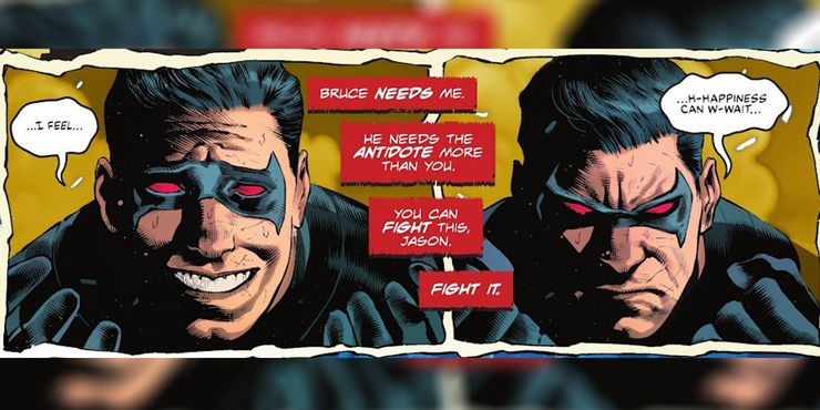 Lo que “Cheer” logra hacer es mostrar el poder emocional de sacar a Red Hood de un contexto excesivamente moralizante, evidente en cómo su rabia es fundamental para salvar a sus seres queridos. Esto es apropiado, considerando que la droga Cheerdrops que él y Batman estaban rastreando abruma a sus usuarios con una sensación de euforia. En el clímax del número seis, Red Hood viene a rescatar a Batman de la guarida del villano Cheer, donde a su antiguo mentor le habían administrado una gran dosis de la droga. Cuando lo rocían con el gas Cheer, Jason lucha contra la feliz ilusión que le da la droga aprovechando su rabia. Este es un paso importante, porque Jason luchando contra el gas Cheer le permitió luchar junto al resto de la Bat-Familia, que acudió en su ayuda inmediatamente después. Por lo tanto, la decisión de Jason de permanecer enojado, en lugar de ceder a la ilusión de felicidad que brindaba Cheer, ayudó finalmente a integrarse en el resto de la Bat-Familia. En lugar de alejarlo de ellos, la ira de Red Hood era exactamente lo que la Bat-Familia necesitaba para salvar a su mentor.