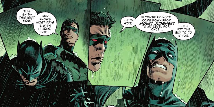 La nueva versión de Zdarsky de la ira de Red Hood es más evidente cuando habla de Batman para que no mate a Cheer. Después de que Red Hood le inyectara un antídoto, Batman estaba tan abrumado por la rabia contra Cheer que lo colgó del borde de un edificio. Para evitar que rompiese su regla más importante, Jason le dijo a Batman: “¡Este no eres tú! Dios sabe que la mayoría de los días desearía que lo fuera, pero … no lo es. Si vas a bajar del Monte Juicio a mi nivel por una vez … Él no es el hombre por quien hacerlo “.