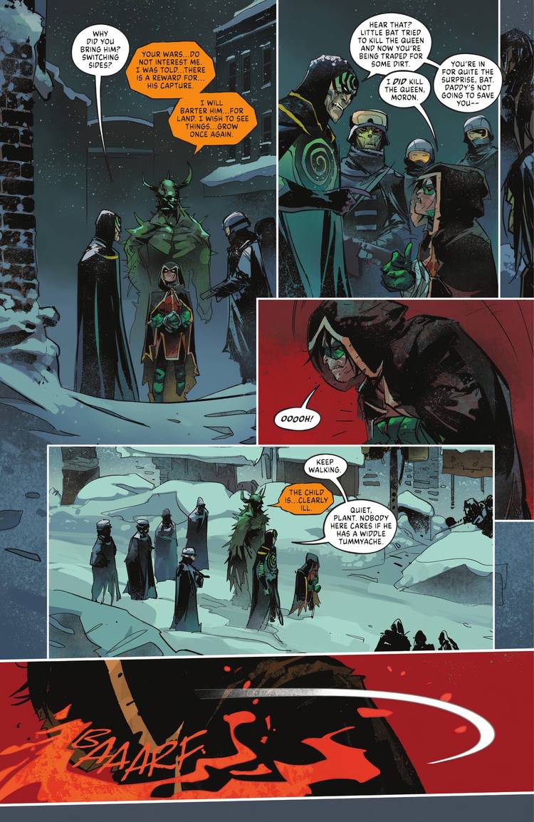 Usando la tecnología del átomo en DC contra vampiros: V Guerra Mundial #5 de Matthew Rosenberg y Otto Schmidt, la resistencia humana, compuesta por Green Arrow, Black Canary, Killer Moth, Midnighter, Zealot y Killer Croc, fue encogido y tragado por Damian Wayne, quien luego regurgitó al equipo cuando se lo ordenó.. Damian vomita violentamente en el suelo y resulta que su vómito contiene resistencia humana.
