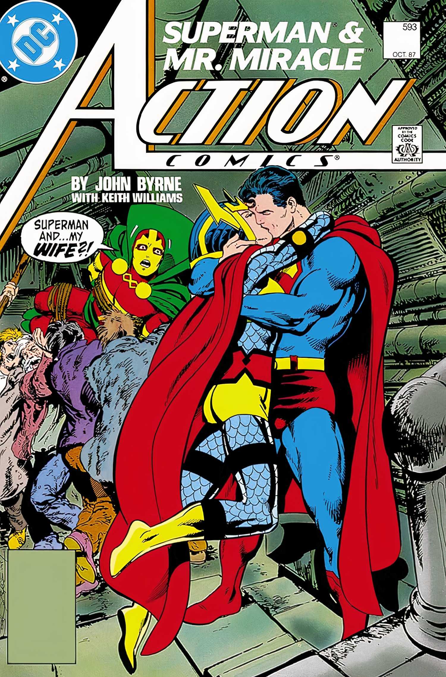 DC tiene muchas parejas de poder entre sus héroes. Y al igual que Superman tiene un romance apasionado con Lois Lane, Big Barda siente el mismo afecto por su esposo, Mister Miracle. Sin embargo, Action Comics #593 cubierta de John Byrne había Superman y Barda besándose mientras Mister Miracle se ve obligado a ver. Action Comics #593 Recoge de donde dejó el número anterior cuando el hombre de acero y el guerrero apokoliptiano cayeron bajo el mando hipnótico de un villano conocido como Sleez.