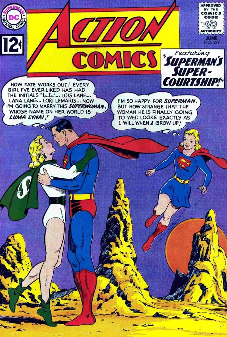 Chico, Superman simplemente no tiene suerte cuando se trata de Action Comics ‘ cubiertas, ¿eh? Pero años antes de su incómoda pose con Big Barda, el hombre de acero estaba aceptando un nuevo interés amoroso en la portada de Action Comics #289 por Curt Swan, George Klein e Ira Schnapp. De un vistazo, no parece que haya nada malo con esta portada, Solo Superman parece estar enamorado mientras su primo, Supergirl mira con aprobación.