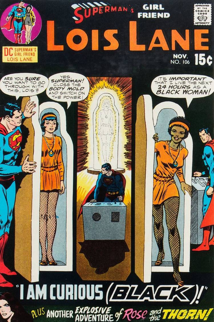 A veces, las historias se pueden hacer con la mejor intenciones y aún así aparecen como increíblemente sordos. Tal es el caso de La amiga de Superman #106cuya cobertura de Curt Swan, Murphy Anderson y Gaspar Saladino han sufrido un curioso procedimiento. Con Superman y un molde corporal, El hombre de acero ayuda a Lois a transformarse de una mujer blanca en una mujer negra durante las próximas 24 horas.