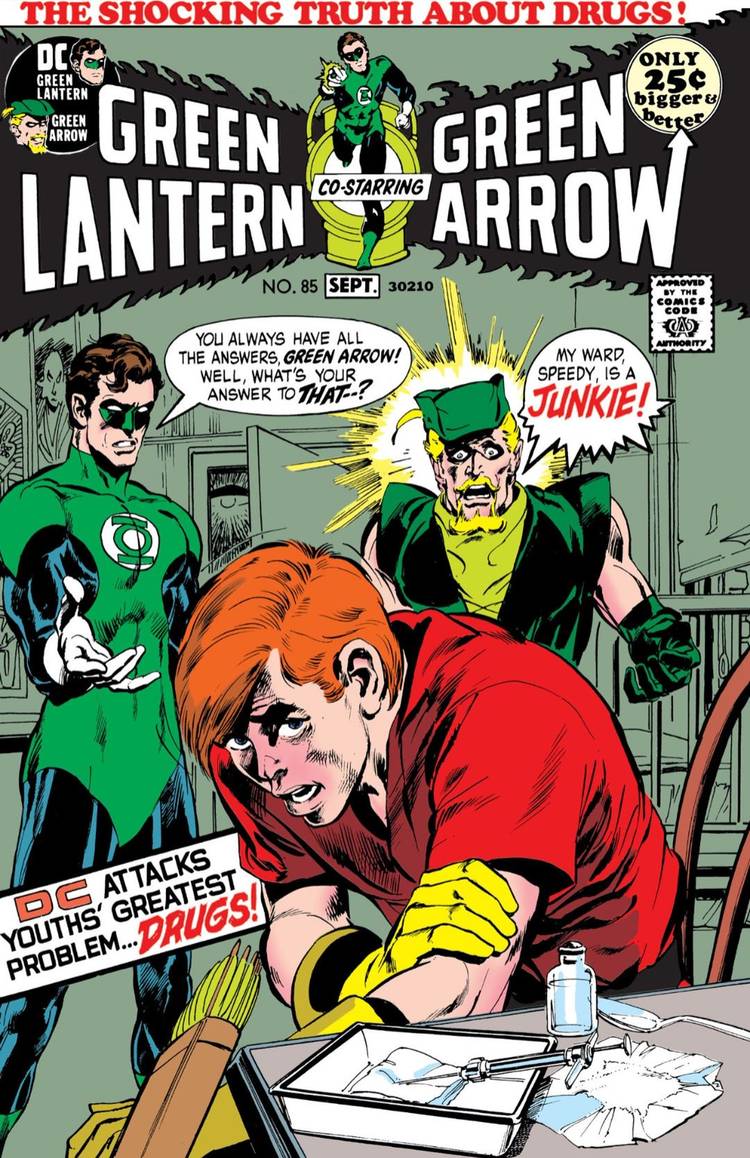 Dennis O’Neil y Neal Adams ‘ Linterna verde La carrera es recordada por muchas cosas, especialmente los riesgos que tomó explorando problemas sociales profundos en la América moderna. Pero no hay cobertura de esta época para el Caballero Esmeralda, más duro que Linterna verde #85 por Neal Adams y Jack Adler, que ve a Hal Jordan revelando una verdad impactante a Green Arrow. Speedy, el compañero de Oliver Queen, se había vuelto adicto a la heroína Y la portada muestra a los héroes atrapando al joven justo antes de poder disparar.