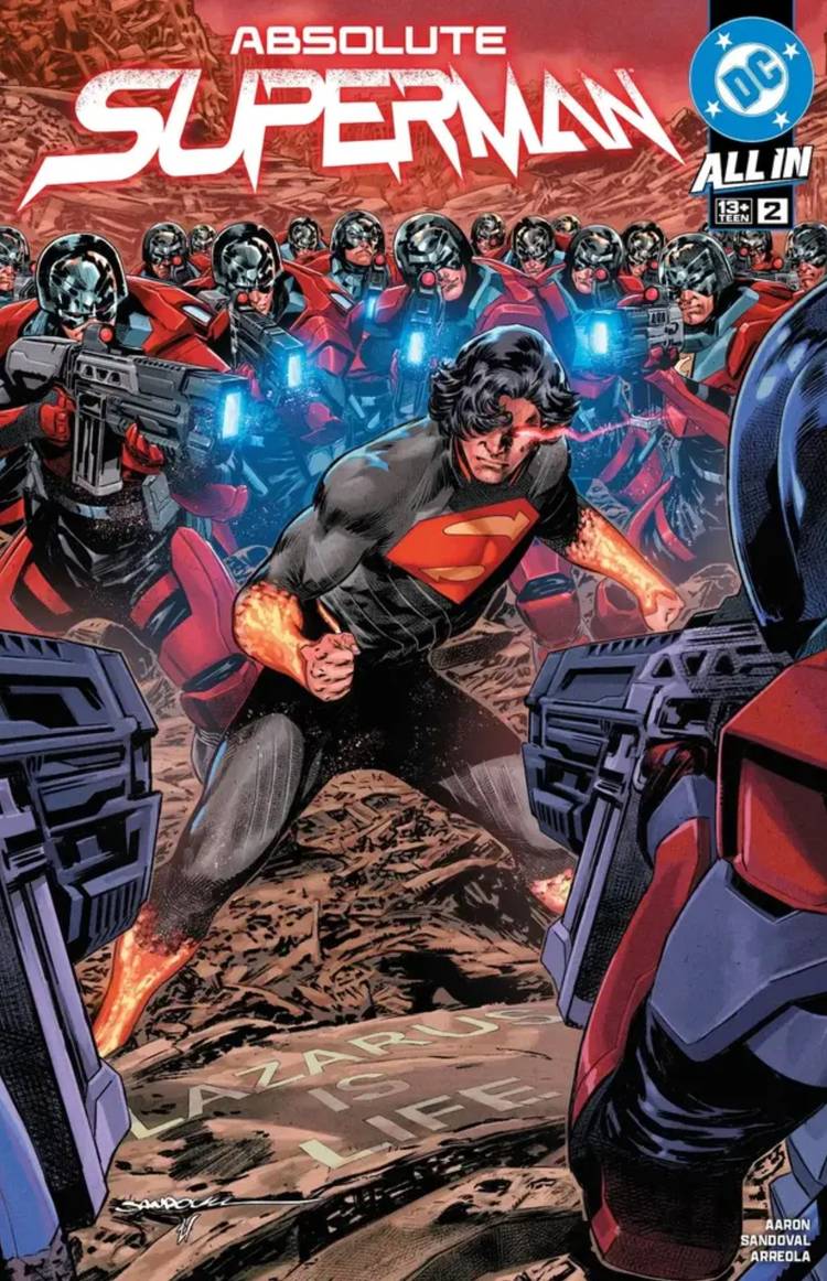 Jason Aaron, Rafa Sandoval, and Ulises Arreola’s Superman absoluto El número 2 continúa justo donde terminó el número anterior, con la agente de Lazarus, Lois Lane, esposándose al Hombre de Acero en un intento de detenerlo. Sin embargo, las cosas rápidamente salen mal cuando Kal-El arrastra a Lois mientras él evade al resto de Lazarus Corps Force, dándole a Lois una mirada de primera mano a los actos heroicos y habilidades de Superman.