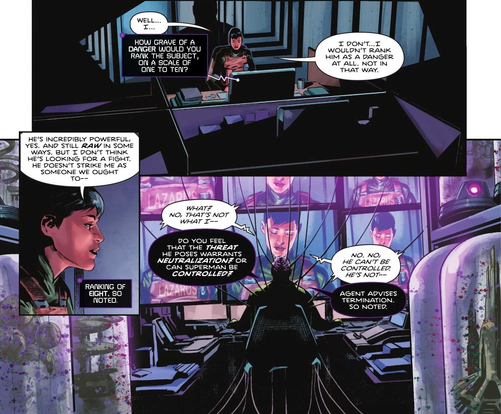 Una vez que Superman se libera de las esposas, los dos toman caminos separados, y Lois regresa a la sede de Lazarus para registrar su informe sobre el Hombre de Acero. Esto lleva a Superman a recibir su clasificación oficial de nivel de amenaza: un sólido 8 sobre 10.
