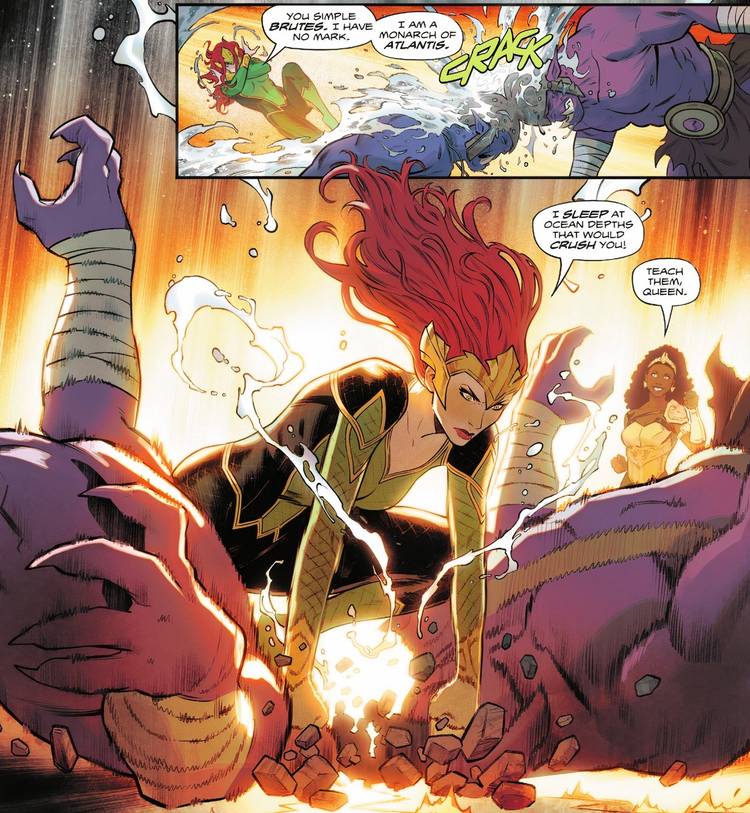 El objetivo de la estrategia de Mera es engañar a Draug haciéndole creer que ha sido afectada por la Marca del Caballero, lo que debilita a sus aliados de la Liga de la Justicia. Sin embargo, sin que los Draug lo sepan, su rendición es simplemente un acto para ganarles ventaja. Una vez que sus oponentes han bajado la guardia, Mera ataca usando su hidroquinesis, golpeando dos de sus cabezas y aniquilándolos rápidamente. Mientras ataca, declara: “Soy un monarca de la Atlántida. ¡Duermo en profundidades del océano que te aplastarían!” Las poderosas palabras de Mera la solidifican como una fuerza a tener en cuenta, y Batman lo sabe.