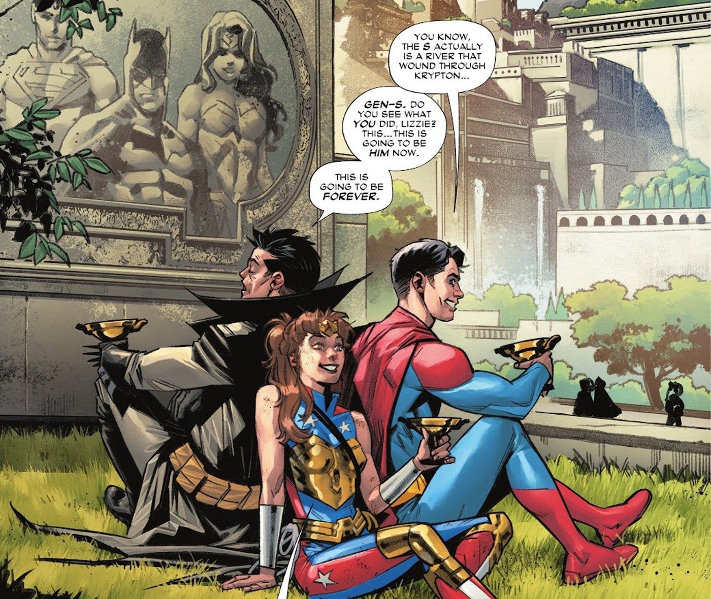 La historia de “Los mejores del mundo” de Tom King y Belen Ortega de Mujer Maravilla El número 5 reúne a los lectores con la próxima generación de Trinity de DC: Jon Kent como Superman, Damian Wayne como Batman y Lizzie, la hija de Wonder Woman, conocida como Trinity, mientras el trío compite para decidir el nombre oficial de su equipo. Finalmente se decidieron por “Gen-S” para reflejar la esperanza que representan en este futuro aparentemente problemático, y este nombre toca la fibra sensible de Superman en particular.